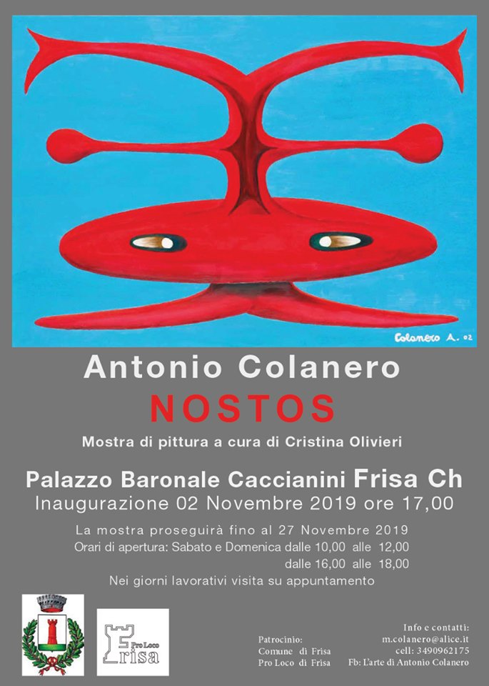 Frisa, 29 ottobre 2019. Sarà una mostra antologica dedicata a un’artista di casa, Antonio Colanero, ad inaugurare i nuovi spazi del Palazzo baronale Caccianini, che il comune di Frisa ha restaurato ed aperto al pubblico destinandolo ad ospitare mostre permanenti e mostre temporanee.