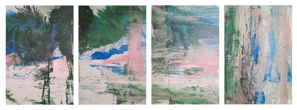 Paolo Fabiani lavora sul colore attraverso l’uso del soffio come gesto primario di creazione o di campiture stese in modo imprevedibile, dando forma a una pittura libera e pienamente consapevole. Ne è esempio il potente quadrittico in mostra, Cosa mi hai portato a fare a Posillipo se non mi vuoi più bene, in cui percepisce perfettamente la sua libertà di lettura del mondo interiore attraverso un uso orizzontale della materia sia essa pittorica o scultorea.