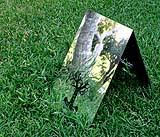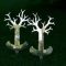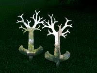 - Cinque alberi, simbolo universale di energia vitale, hanno base curvilinea, simbolo di possibilità di assestamento e di equilibrio, realizzati anch'essi con alluminio riflettente fronte e retro, di h. 50cm., posti perpendicolarmente, "piantati" nel prato, in incavi intesi come piccole feritoie della e nella terra, rimandano ad antenne di connessione tra territorio e cielo.