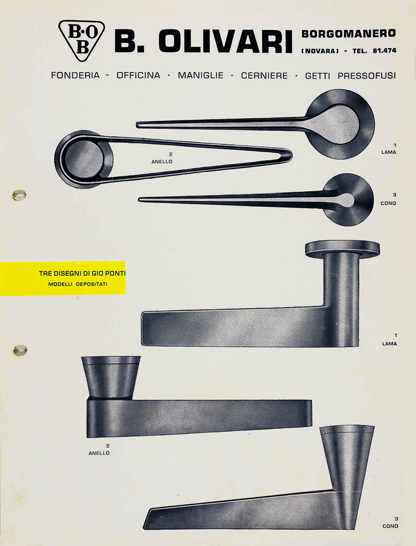 Olivari presenterà tre maniglie che Gio Ponti ideò in occasione della costruzione del grattacielo Pirelli: Lama, Cono e Anello. Tre modelli frutto della riflessione sul tema della leggerezza, della riduzione della forma e del materiale, per i quali vennero sperimentati e utilizzati l’ottone e l’alluminio.