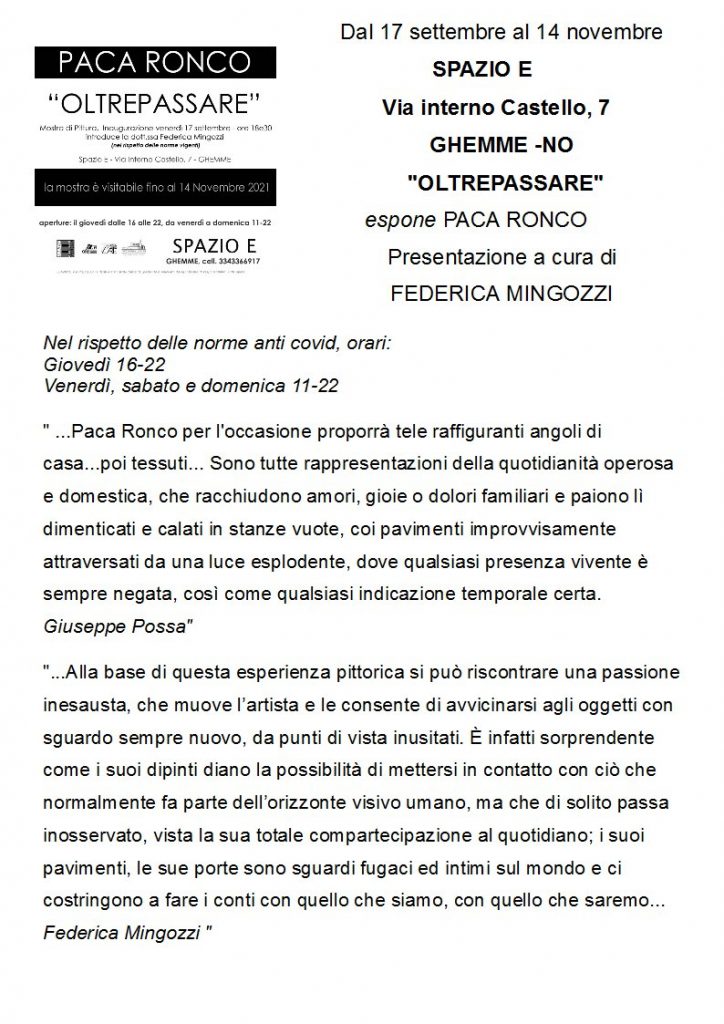 La pittrice Paca Ronco esporrà nello Spazio E di Ghemme (NO), via interno Castello 7, una trentina di quadri dei cicli “tessuti” e “pavimenti”. A inaugurare la personale il 17 settembre, alle ore 18.30, sarà la professoressa Federica Mingozzi; la mostra si potrà visitare nel rispeto delle norme vigenti fino al 14 novembre, nei seguenti orari: giovedì 16-22; venerdì, sabato e domenica dalle 11 alle 22