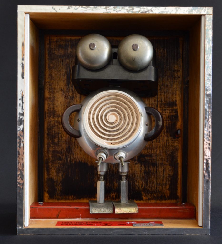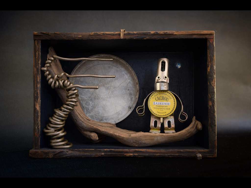 Nelle mani dell'artista gli oggetti più disparati, bulloni, orologi rotti, vecchie radio, leve, manovelle, lamiere, ganci prendono vita in modo sorprendente. Ma in fondo una vita l'hanno avuta o forse l'hanno ancora, ed è come se dal vecchio cassone chiamassero con invocazioni che solo una mente creativa può cogliere.