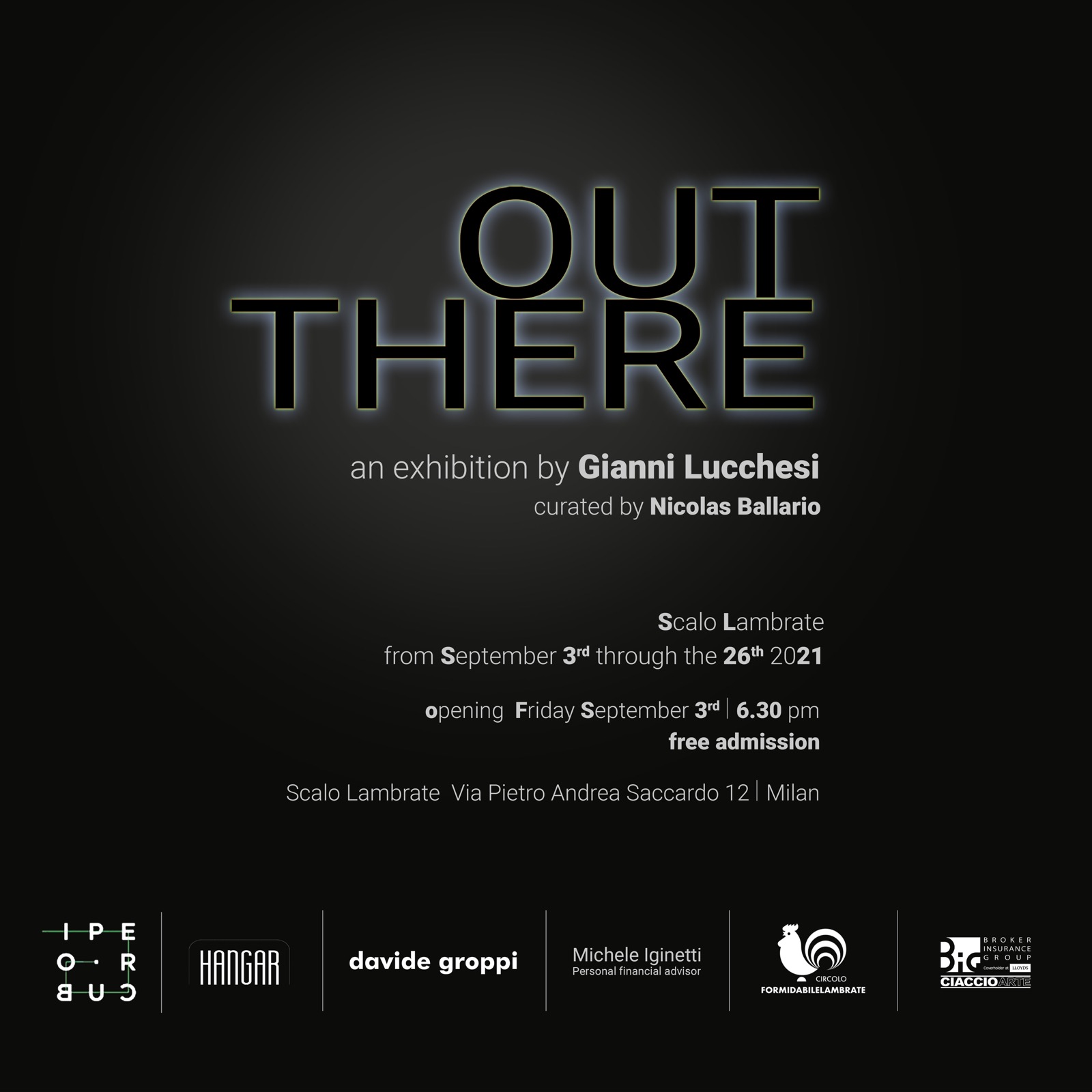 Galleria IPERCUBO è lieta di annunciare OUT THERE, una mostra di Gianni Lucchesi (Pisa, 1965) con la collaborazione di Davide Groppi come Lighting designer e curata da Nicolas Ballario. Lucchesi presenterà opere inedite, tra cui una serie di sculture in bronzo e ferro insieme a due dipinti di grandi dimensioni in bitume. L'esposizione si inaugurerà venerdì 3 settembre alle 18.30 negli spazi di Scalo Lambrate, Via Saccardo 12, 20134, Milano e rimarrà aperta fino al 26 settembre dalle 16 alle 22,