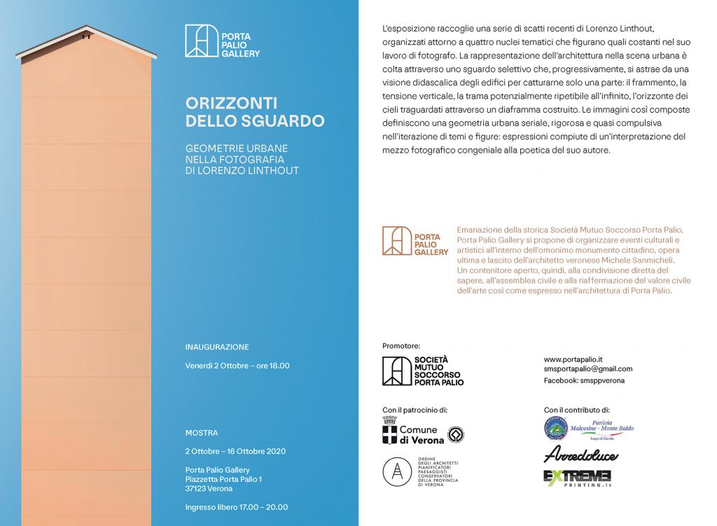 Mostra fotografica personale composta da cinquanta immagini, organizzati attorno a quattro nuclei tematici che figurano quali costanti del lavoro del fotografo. La rappresentazione dell’architettura nella scena urbana è colta attraverso uno sguardo selettivo che, progressivamente, si astrae da una visione didascalica degli edifici per catturarne solo una parte: il frammento, la tensione verticale, la trama potenzialmente ripetibile all’infinito, l’orizzonte dei cieli traguardati attraverso un diaframma costruito. Le immagini così composte definiscono una geometria urbana seriale, rigorosa e quasi compulsiva nell’iterazione di temi e figure: espressioni compiute di un’interpretazione del mezzo fotografico congeniale alla poetica del suo autore.