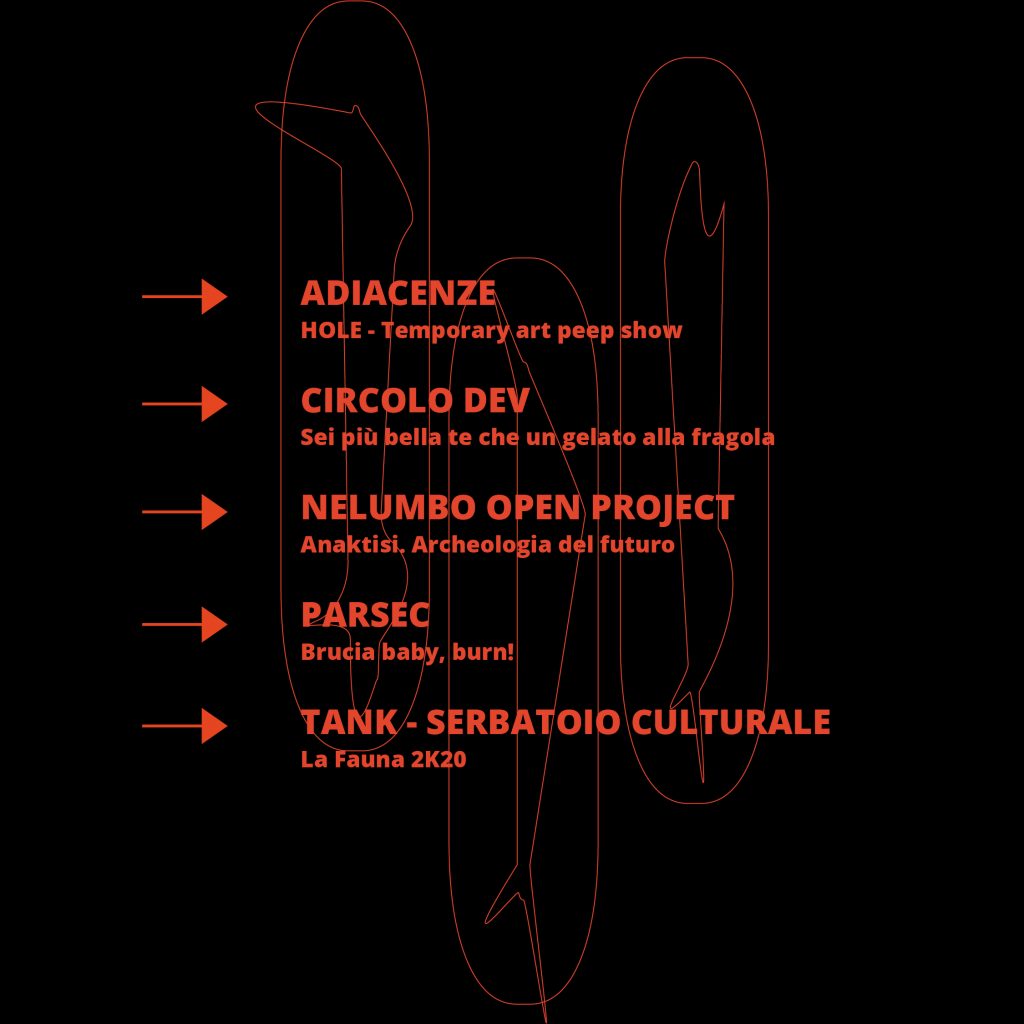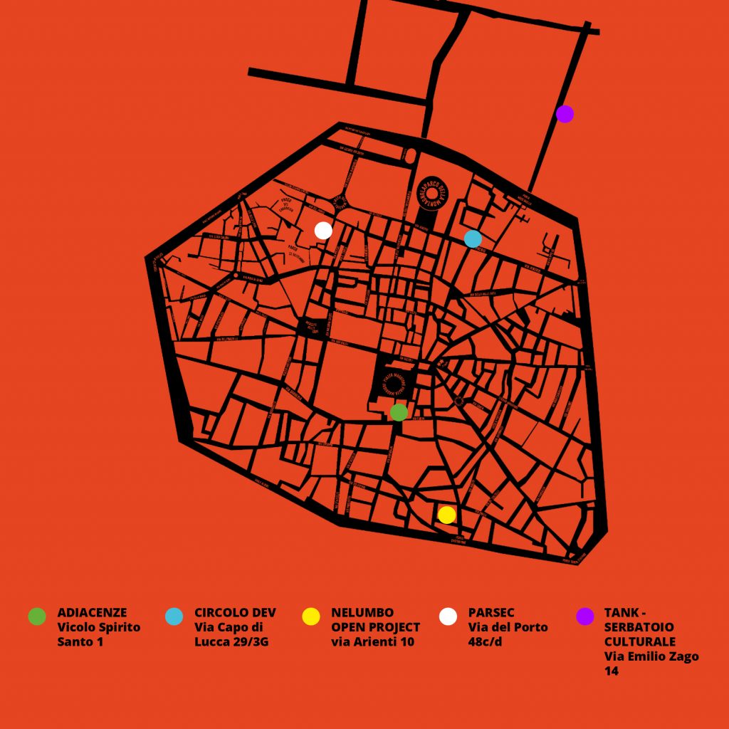 Le crisi portano alla luce le questioni irrisolte. Questa città (questo Paese) ha un enorme problema di incuria e disattenzione riguardo la produzione di cultura dal basso, in particolare la cultura diffusa che si deve agli spazi indipendenti come i nostri.Ci proponiamo allora il disvelamento di una realtà viva ma nascosta agli occhi della città perché la città è divenuta incapace di pensare oltre le logiche espositive trite e ritrite, perché basa la validità di un’azione culturale sul profitto e non sul suo valore sociale, perché considera le aggregazioni di energie e di idee come una minaccia allo status quo e, quando non le ostacola apertamente, si guarda bene dal favorirle.Le realtà culturali no-profit, infatti, pur garantendo la sicurezza e adempiendo alle norme anti-covid, sono state impossibilitate ad aprire i propri spazi e a continuare la loro attività.Dal 28 al 30 aprile alzeremo quindi le saracinesche, illumineremo le vetrine, useremo i tetti e le mura esterne dei nostri spazi per offrire al pubblico installazioni fruibili dal “di fuori”, dall’esterno.In che modo? Alterando e sovvertendo. Lavorando in maniera interdisciplinare e instaurando un giusto dialogo tra le diverse realtà che si sentono parte di un progetto comune. Abbiamo creato una mappa: useremo la tecnica della costellazione di eventi. A fine maggio invece, scenderemo in strada con azioni artistiche e culturali delle realtà che hanno definitivamente perso il proprio spazio. Entrambe le iniziative si terranno nel pieno rispetto delle misure di sicurezza anti-covid19.Gli eventi, oltre a mostrare l’insensatezza di voler dividere la cultura in spazi di serie A e di serie B, vogliono avviare un ragionamento sul significato della produzione artistica nella vita sociale di una città e sul ruolo degli spazi indipendenti in questo processo, affinché le associazioni culturali siano riconosciute come fondamentali per la vita della città.È con spirito indomito e di rivalsa verso le istituzioni che ci hanno abbandonato che oggi presentiamo alla città il nostro progetto: OUT OF ORDERLe varie realtà: ADIACENZE - DEV - ELASTICO - LABORATORIO L’ISOLA - NELUMBO Open - PARSEC - TANK