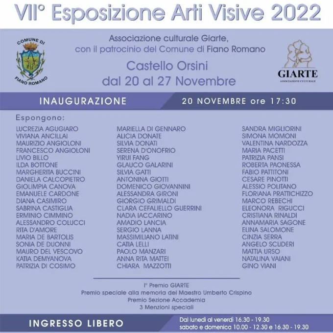 VII° Esposizione Arti Visive. Mostra d'arte internazionale , con il Patrocinio del Comune di Fiano Romano Inaugurazione 20 Novembre ore…
