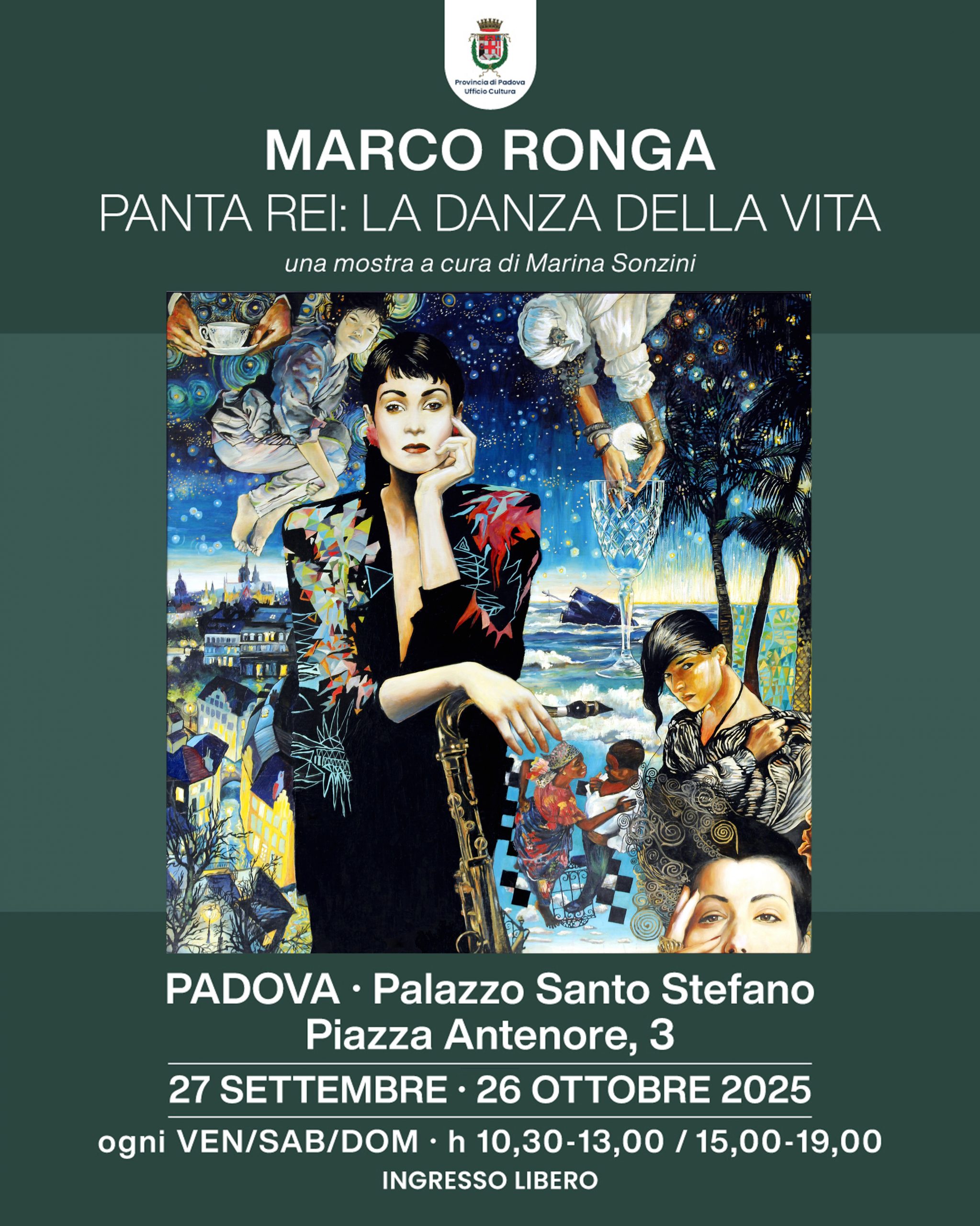 Con "Panta rei: la danza della vita", Marco Ronga mette in mostra un percorso artistico lungo quarant'anni (1985-2025): volti che raccontano storie, paesaggi che custodiscono memorie, corpi che diventano simboli, uno sguardo autentico e in continua evoluzione sull'animo umano e sulla contemporaneità. Curatrice: Marina Sonzini. Luogo: Museo di Palazzo Santo Stefano, Piazza Antenore 3 – PADOVA. Dal 27 settembre al 26 ottobre 2025. Inaugurazione sabato 27 settembre alle ore 10,30.