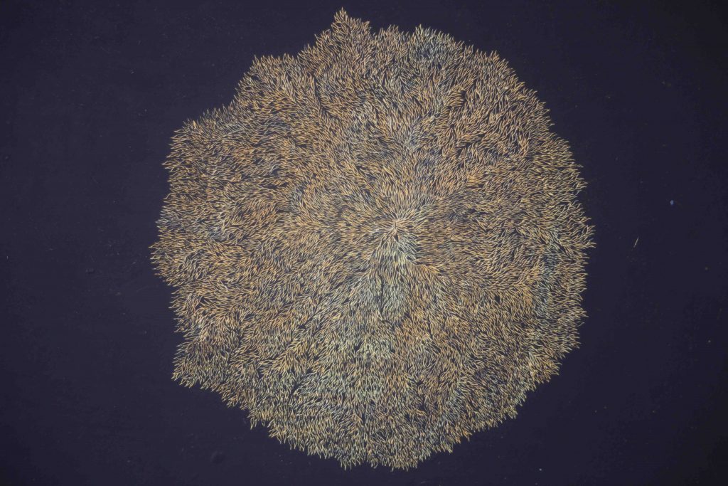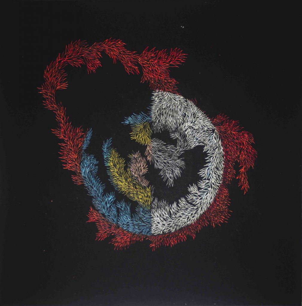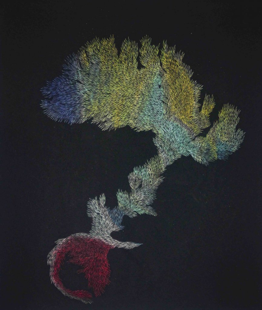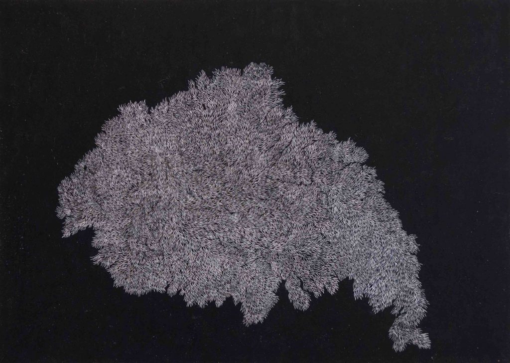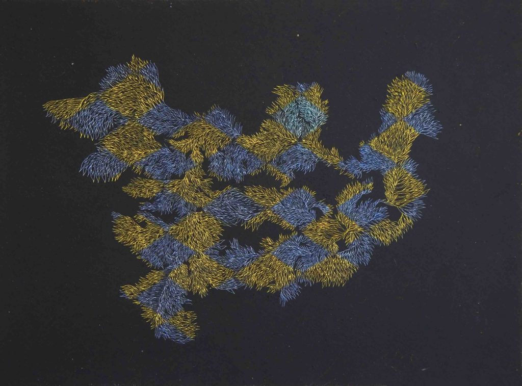 Un racconto senza linguaggio, un linguaggio senza parole. Sono le forme create dall’artista Cinzia Delnevo, accumuli poetici e quasi-organici di piccoli segni ripetuti in una temporalità dilatata, simile a quella della meditazione. Un accumulo paradossale che procede per sottrazione, riscoprendo e reintegrando quelle cose tralasciate al di sotto di un manto di colore nero: cromatismi e forme appena intuibili, disegni sommersi e non più percepibili, se non attraverso quella tessitura rarefatta di un racconto senza linguaggio, di un linguaggio senza parole.