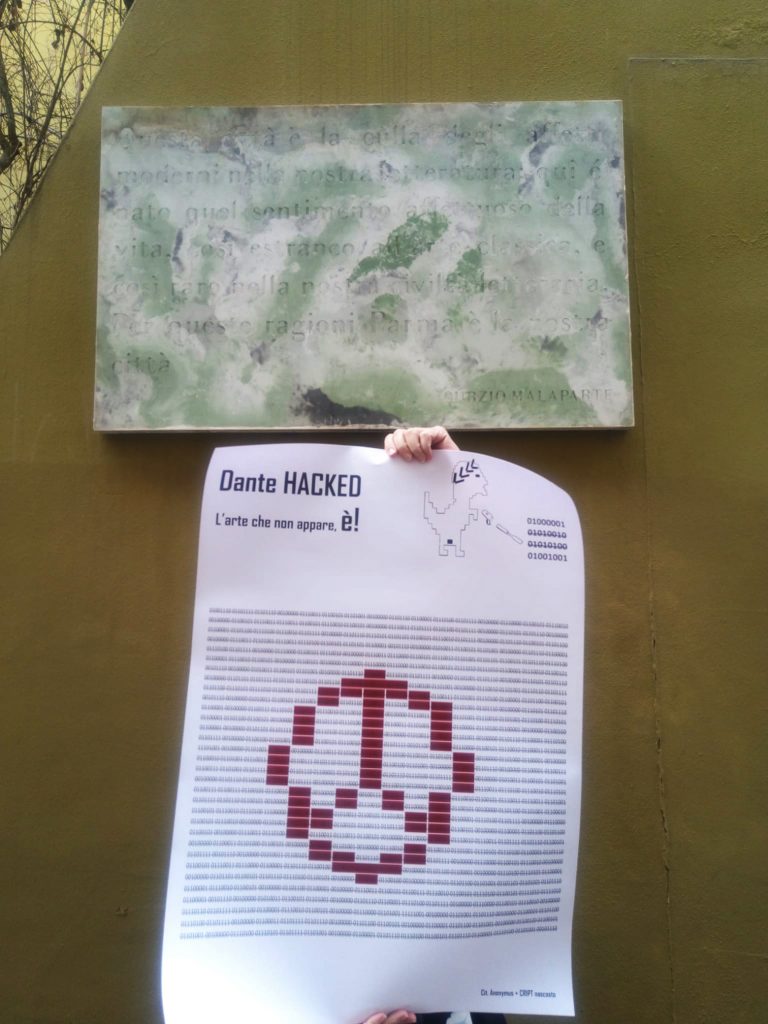 Proprio su quell’onda emotiva ed in funzione del contemporaneo che viviamo, il progetto Dante HACKED; passando per i luoghi Istituzionali delle arti come Parma Art Fair –ospite del padiglione 81/ Bianco scuro-, contamina il territorio e la città di Parma. Da Hotel a vie e commercianti, l’arte torna a vivere “nei luoghi della gente che vive la gente”.