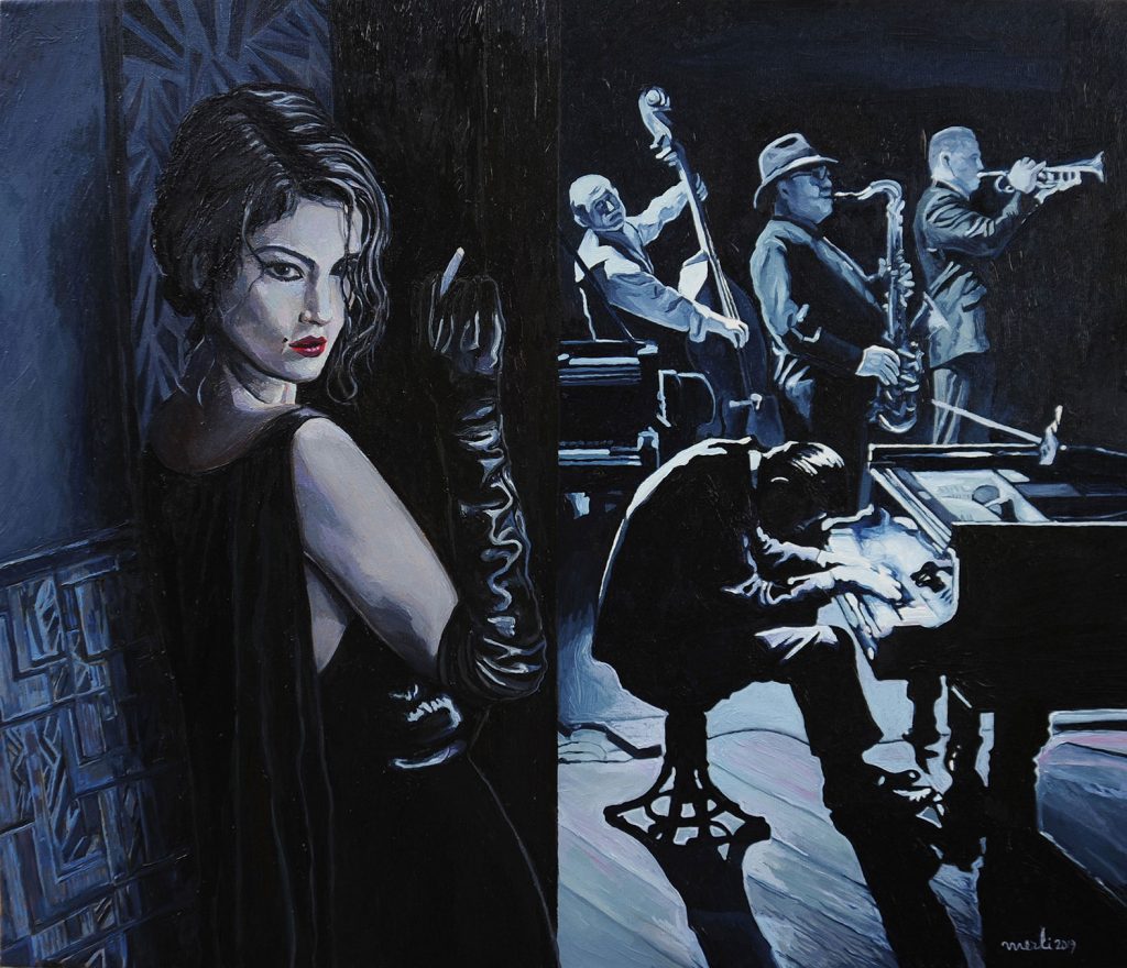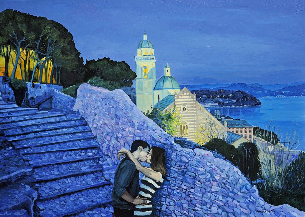 Enrico Merli affida la sua ispirazione principalmente a due temi: la figura umana e il paesaggio che comunque sovente si incontrano per un magico connubio. Egli infatti intinge le sue opere in un clima di sospensione estatica. Lo possiamo constatare nelle riflesse luci della sera che caratterizzano “Ganzirri” o in una “Chiavari” accarezzata dai bagliori dell’ultimo sole al tramonto. Anche “Il faro di Portofino” si avvale di una interpretazione che accoglie nell’anima di chi osserva le morbide seduzioni dell’imminente sera da condividere con “Tramonto a Punta Chiappa”. La scoperta di un tale palcoscenico emozionale viene quindi trasferita in particolari scene che offrono l’incanto di un momento: ci riferiamo in particolare al “Sogno condiviso” di due innamorati che contemplano il cielo stellato, un comportamento amoroso che ritroviamo nel mosaico incantevole di “Bonassola” e nell’alato “Magico incontro” che profuma di sogno. Perfino la trattenuta tristezza di “Matilde” è confortata dallo sguardo al miele della luna mentre “La bellezza salverà tutto” è un’auspicabile promessa esibita dalla leggerezza di una ballerina in tutù e in punta di scarpette che ha come sfondo uno scorcio di Lavagna.
