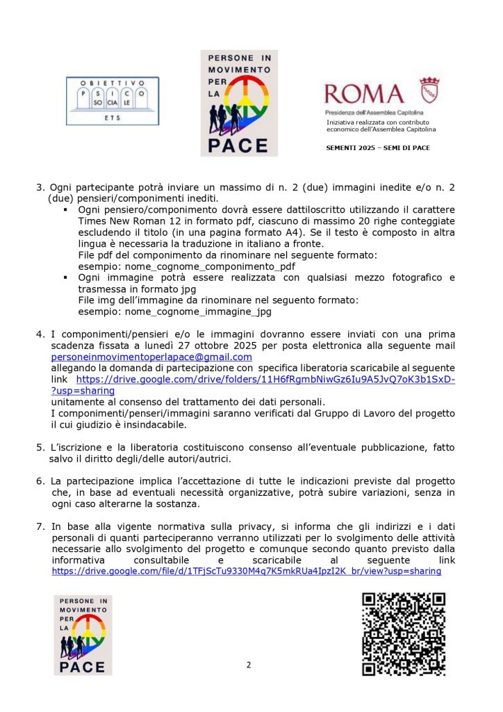 Ha preso avvio il progetto PERSONE IN MOVIMENTO PER LA PACE promosso e coordinato da Obiettivo Psico Sociale ETS per rafforzare e promuovere la Cultura dei Diritti e della Pace e contemporaneamente favorire e sostenere lo sviluppo delle azioni di rete, di solidarietà e di comunanza territoriale perché la pace non si costruisce solo attraverso i negoziati internazionali, ma anche negli spazi della vita quotidiana, nelle comunità e nel corso della vita incoraggiando una visione pacifica di dialogo.