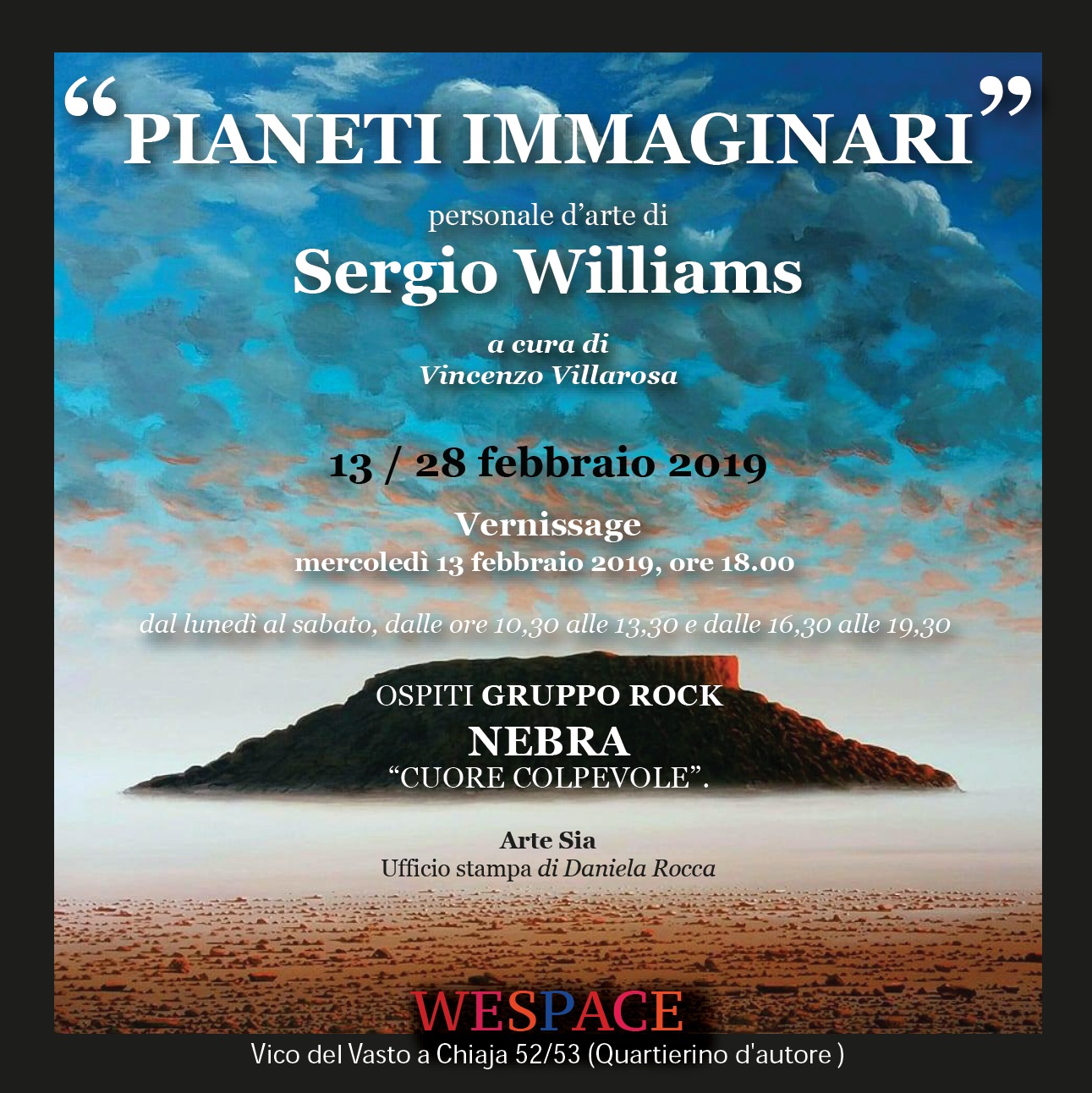 A Napoli Il 13/2/2019 si terra il vernissage per la mostra personale d'arte di Sergio Williams presso la Galleria d'arte We Space in Vico al Vasto a Chiaia, 52. Con Sergio Williams saranno presenti Vincenzo Villarosa, curatore della mostra, e il gruppo rock Nebra, ospiti di WeSpace, con un live showcase in occasione della presentazione del nuovo album “Cuore colpevole”.