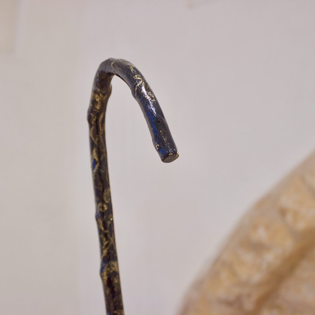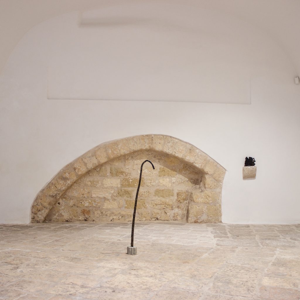 L’errare peregrino sull’altopiano murgiano di Romanelli restituisce un dono che si fa simbolo della sua ricerca in residenza: un vincastro, tipico bastone da pastore, recuperato in una passeggiata sulla Murgia, diventa nobile elemento rivestito secondo un’antica tecnica di doratura. La pratica del cammino in un flusso consapevole di dare e avere si dischiude e si eleva in un sentimento profondo di devozione verso la terra, luogo generoso di ricerca e di riflessione.