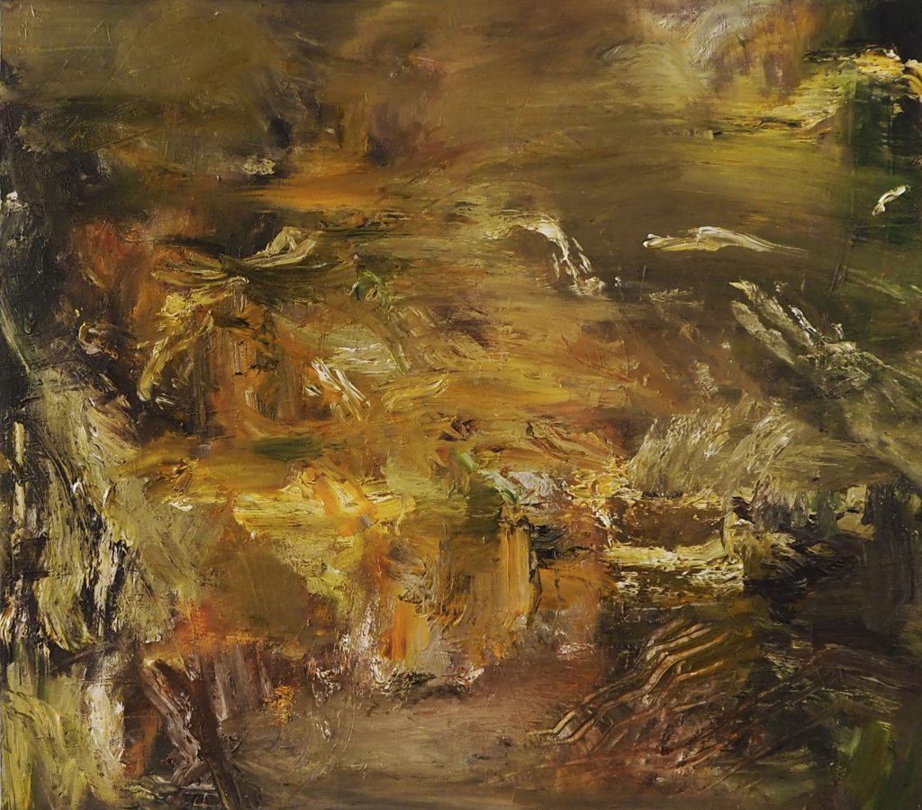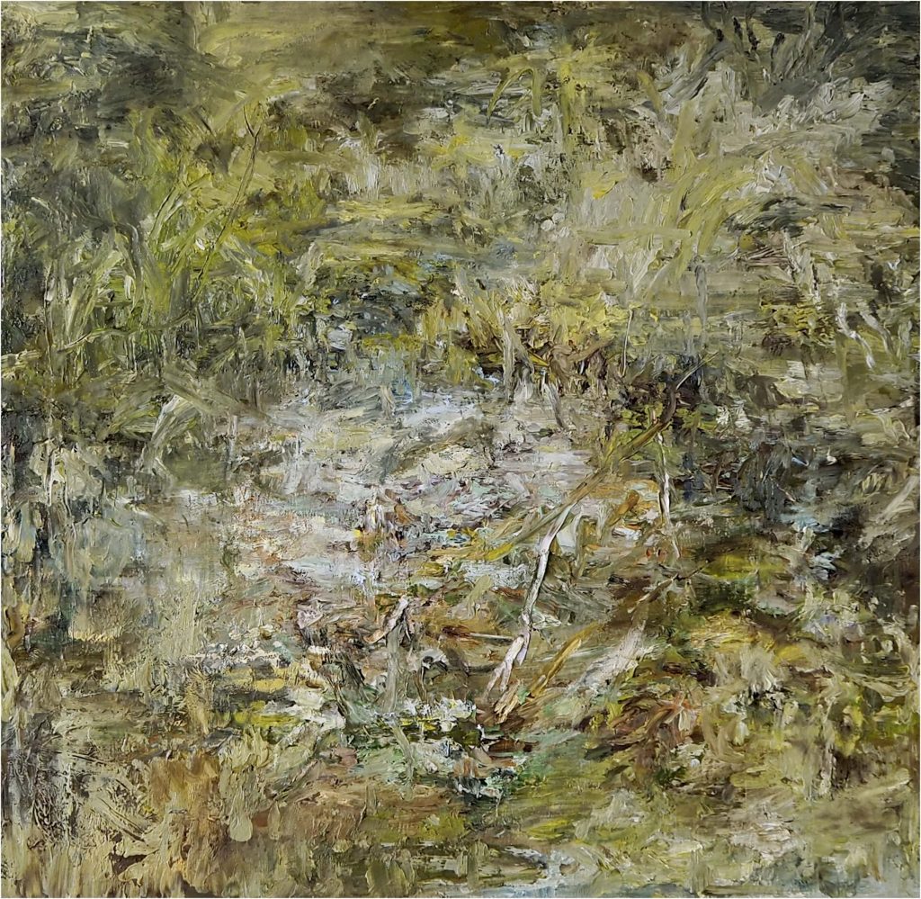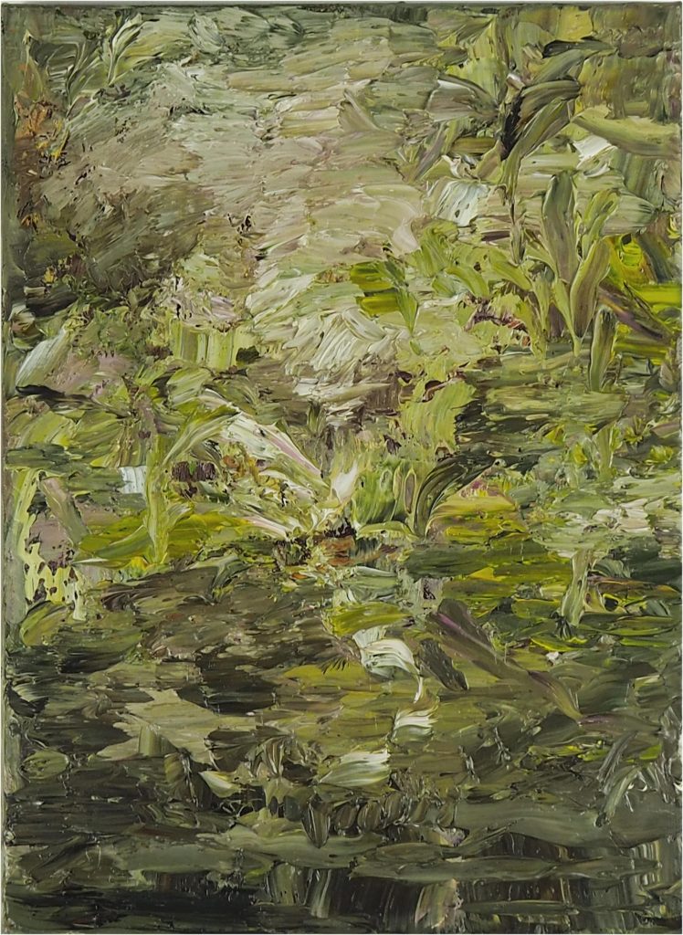 Nascono così composizioni nude, dominate dalle terre, dai verdi e dall’ indaco, dove il paesaggio sembra riflettere su sé stesso. Fuori fuoco in certi punti ma sempre concreta la pittura si offre senza fronzoli allo sguardo dell’osservatore, invitandolo in un viaggio profondo strato dopo strato.