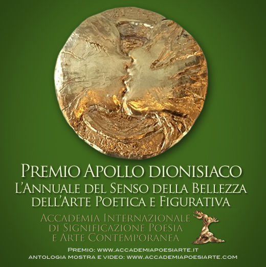 L'Accademia Internazionale di Significazione Poesia e Arte Contemporanea, polo no profit di libera creazione, formazione, ricerca e significazione del linguaggio poetico e artistico, in Convenzione formativa con l’Università degli Studi di Roma Tre, con il Patrocinio della Regione Lazio, di Roma Capitale e dell’Istituto Italiano di Cultura di New York, Presidente la prof.ssa Fulvia Minetti, bandisce la VI Edizione 2019 del Premio Accademico Internazionale di Poesia e Arte Contemporanea Apollo dionisiaco, senza scopo di lucro.