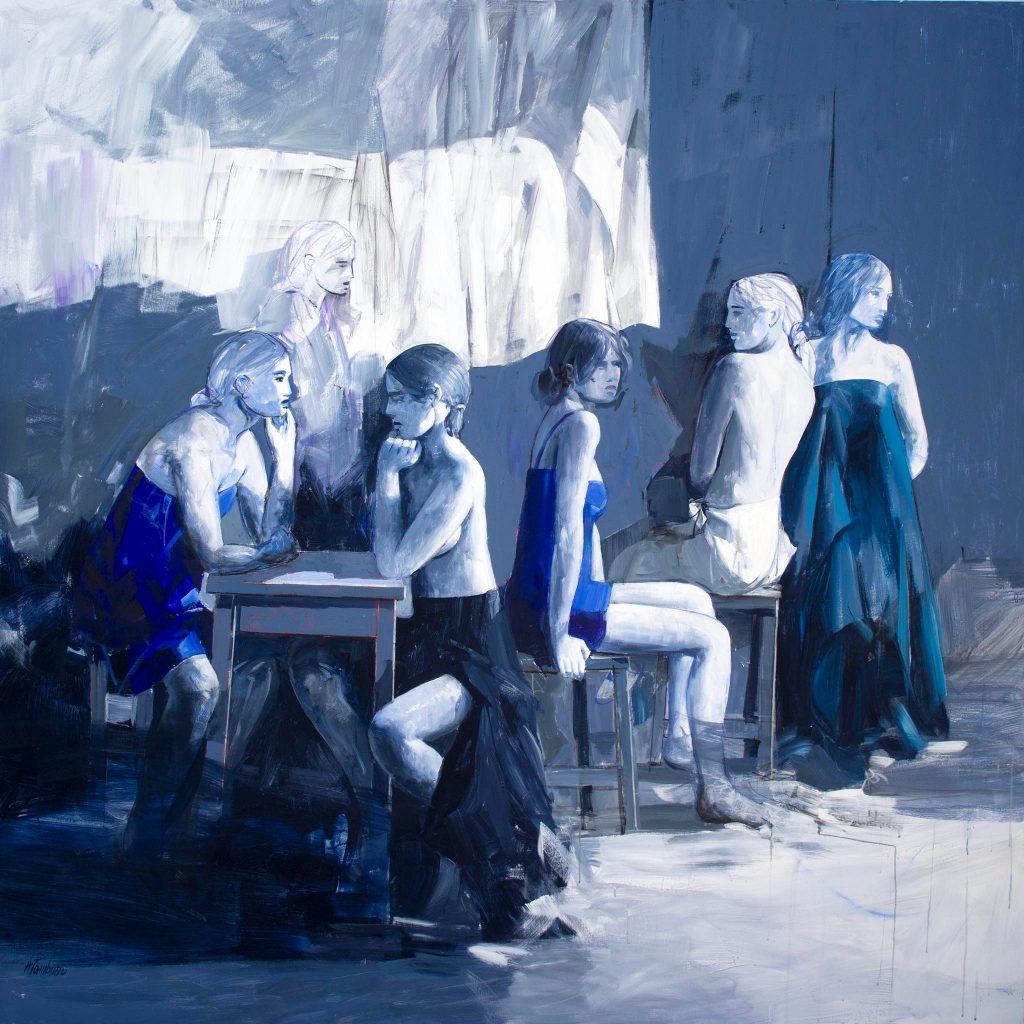 restituisce contemporaneità alla cultura e alla mitologia greca trasformando le protagoniste in eroine contemporanee, muse ispiratici, accomunate dalla volontà di determinare gli eventi o di essere oggetto di grandi dispute come per Elena. L’artista raffigura questo tema creando una dimensione poetica e introspettiva giocando con le sfumature di blu e di bianco e con le campiture di grigio che aggiungono solennità al soggetto. Gli incarnati pallidi in contrasto con i drappeggi blu delle vesti creano un suggestivo ricordo della solennità della statuaria greca, per come è visibile a noi dopo aver perso il colore originario. Lo sfondo blu, i giochi di luce e ombra e l’atmosfera così intima suggeriscono una riflessione profonda che sembra essere indicata già dallo stile utilizzato. La scelta cromatica e il panneggio della donna in piedi sulla destra creano un forte richiamo all’opera La vie di Picasso, un’opera del 1903 esposta al Cleveland Museum di New York, uno dei più emblematici dipinti del Periodo Blu che rappresenta un’allegoria del ciclo della vita. La figura in piedi a destra di Tamburro infatti ricorda quella in Le vie sia per la resa scultorea del soggetto che per l’esecuzione pittorica della veste.