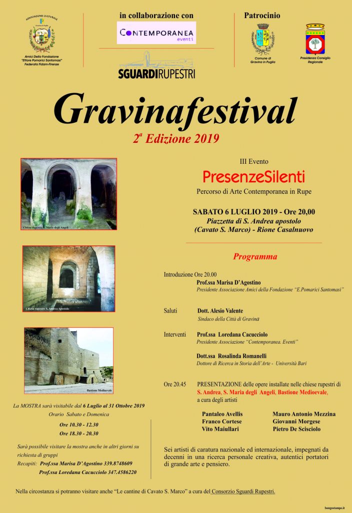 Dunque, il centro storico di Gravina diPuglia dal 6 Luglio al 31 ottobre 2019offrirà un singolare itinerario artistico che partendo dalla Chiesa rupestre di S.Andrea, attraverserà ilBastione e giungerà allaChiesa rupestre di S. Maria degli Angeli
