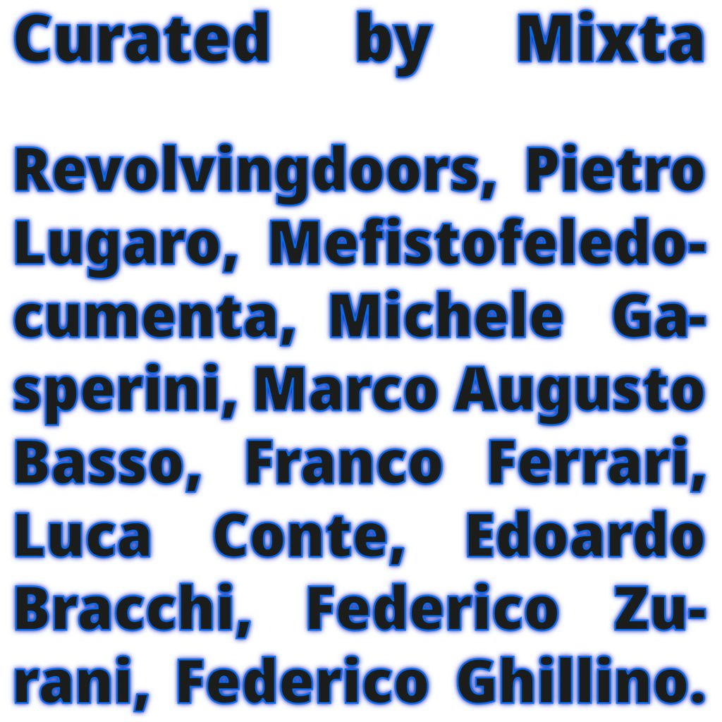 Revolvingdoors, Mefistofeledocumenta, Marco-Augusto Basso, Franco Ferrari, Luca Conte, Edoardo Bracchi, Federico Zurani, Federico Ghillino, Pietro Lugaro, Michele Gasperini.