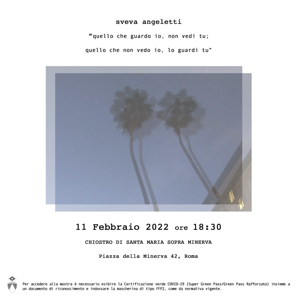 Da venerdì 11 febbraio il seicentesco Chiostro della Basilica di Santa Maria sopra Minerva, nel Rione Pigna, ospiterà “quello che guardo io, non vedi tu; quello che non vedo io, lo guardi tu”, una personale dell’artista Sveva Angeletti.