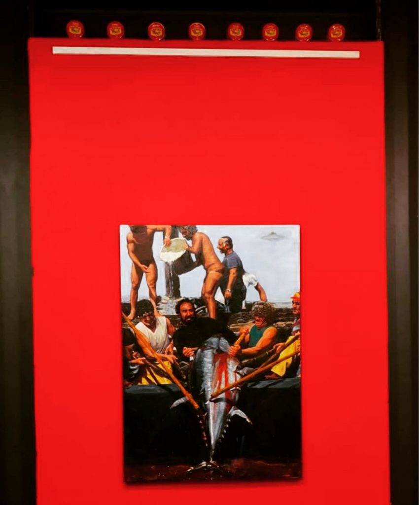 L'opera consta di un dipinto a olio su tela, (100x70) pigmento rosso su parete, scatolette di tonno poste in alto a suggerire “la morte”.