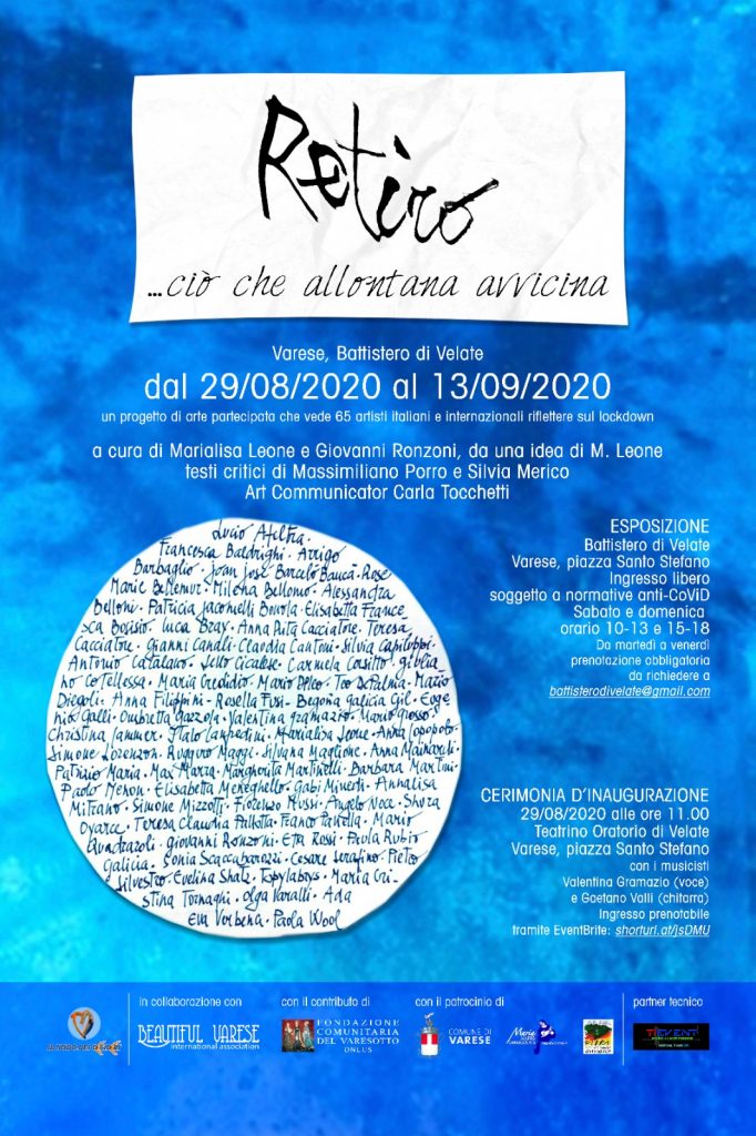 A Varese, presso il Battistero di Velate, a partire da sabato 29 agosto 2020 viene presentato “RETIRO … ciò che allontana avvicina”, un progetto di arte partecipata a cura degli artisti Marialisa Leone di Crema e Giovanni Ronzoni di Lissone. 130 opere su carta di 65 artisti che hanno coniugato immagine e parola pr riflettere sul tema del lockdown. Il progetto è accompagnato da due poesie di Giovanni Ronzoni e dacommenti critici a cura di Massimiliano Porro (Como) e Silvia Merico (Crema).