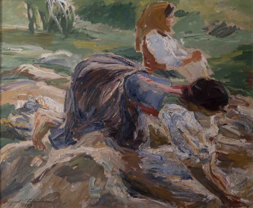 Nelle sue grandi tele si legge la spontaneità dei movimenti, si scorgono figure immerse in un’atmosfera rarefatta, una emblematica luce del sole radente e poi quella mobilità che manca alle opere di Figari, sempre scenografiche e sottomesse al linguaggio accademico delle sue grandi decorazioni.