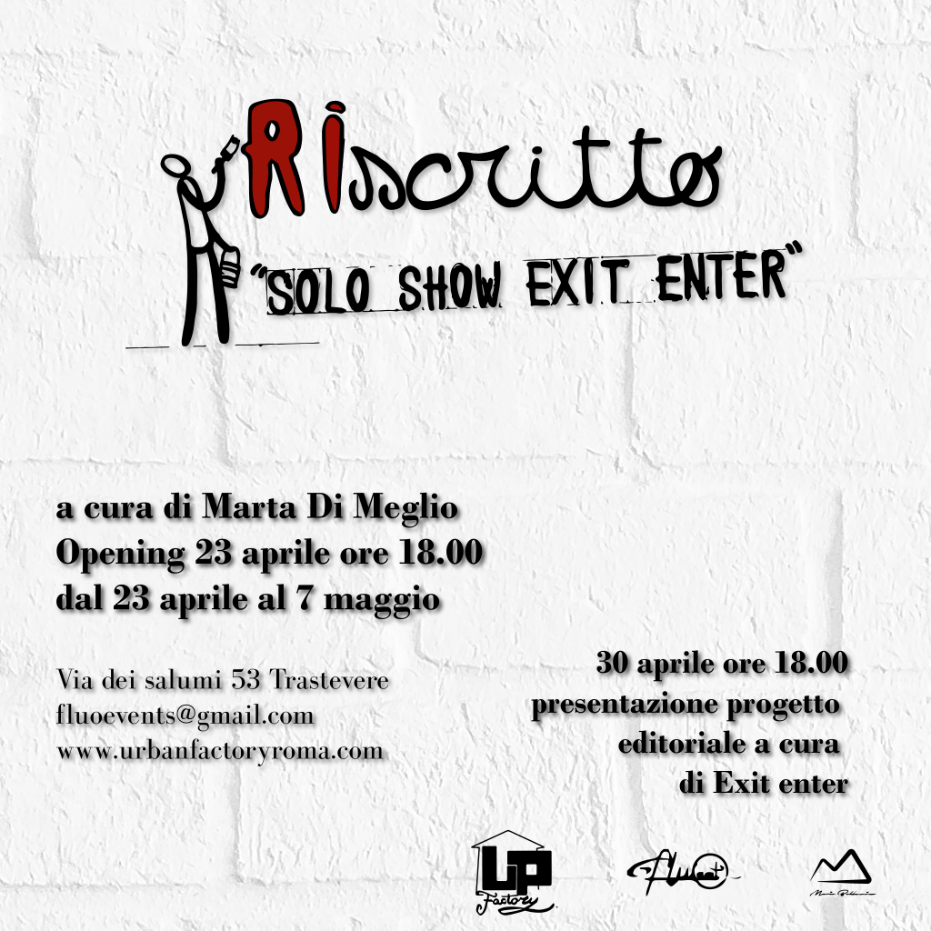 Sabato 23 aprile Up Urban Prospective Factory è lieta di presentare RIscritto mostra personale di Exit Enter a cura di Marta Di Meglio. L’opening si svolgerà da Up Urban Prospective Factory a Trastevere in Via dei Salumi 53.