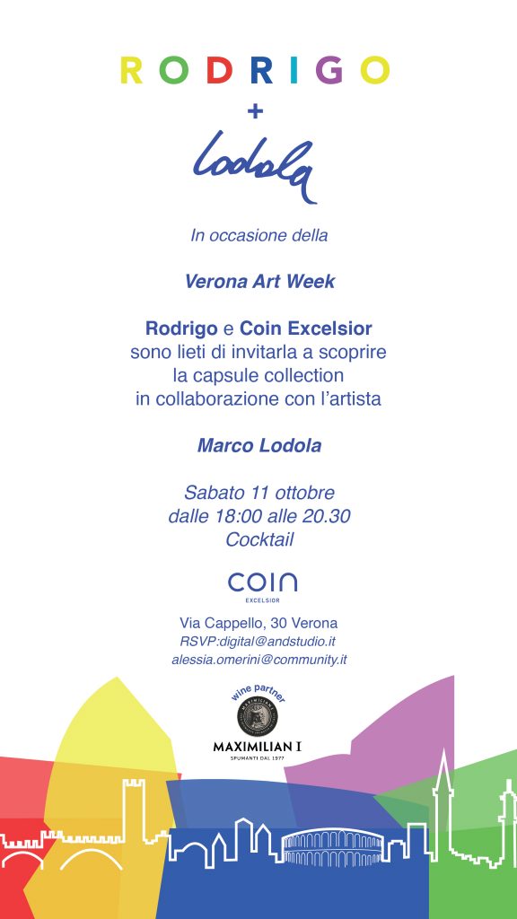 Dopo il successo dello scorso giugno a Milano durante la Fashion Week Uomo, Rodrigo continua le celebrazioni per i suoi cinquant’anni di storia e approda a Coin Excelsior Verona. Un nuovo appuntamento dedicato alla capsule collection Rodrigo + Marco Lodola l’11 ottobre 2025 in occasione della Verona Art Week.