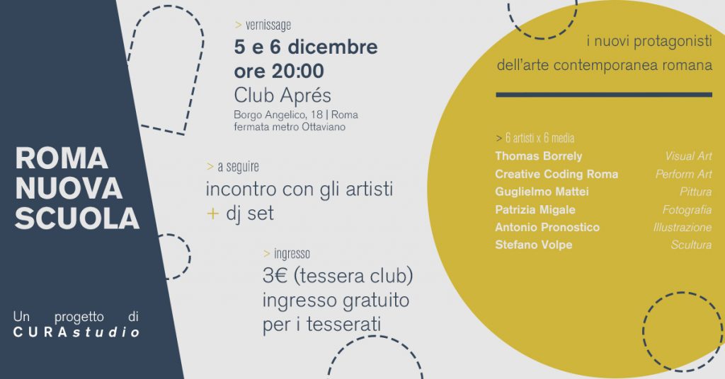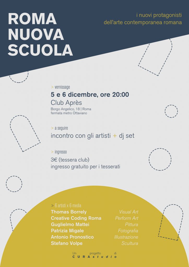 Il doppio vernissage sarà un’opportunità per visitare la mostra in anteprima ed assistere a un dibattito con i protagonisti della collettiva, volto ad approfondire i lavori realizzati per la mostra e il loro rapporto con la città. Com’è che si racconta Roma nel 2018? Alla base di Roma Nuova Scuola c’è la volontà di osservare incuriositi le mille contraddizioni della Capitale; di ribaltare i punti di vista e inciampare in nuove prospettive, celebrando l’incontro-scontro tra la storia millenaria della città e il suo quotidiano, tra il mondo dell’arte e la realtà. Roma Nuova Scuola è perciò un dialogo vivace tra scultura e pittura, illustrazione digitale, matite e chine, fotografia e Perform Art. È soprattutto un’occasione per riscoprire la città e innamorarsene ancora, attraverso le opere di sei artisti di base a Roma, nuovi protagonisti dell’arte contemporanea. La collettiva, a cura di Gabriele Naddeo e Francesco Pascale - rispettivamente giovani curatore e architetto di