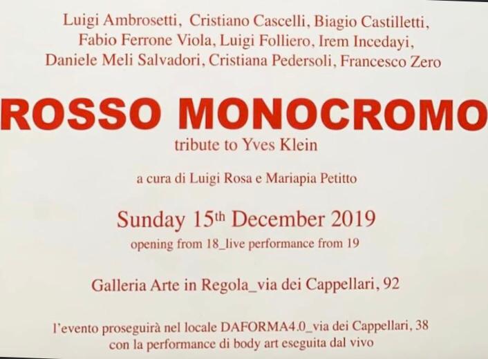 Domenica 15 dicembre alla Galleria Arte in Regola, nove artisti tra i più rappresentativi della scena romana - Luigi (LAC 68) Ambrosetti, Cristiano Cascelli, Biagio Castilletti, Luigi Folliero, Irem Incedayl, Cristiana Pedersoli, Daniele Meli Salvadori, Fabio Ferrone Viola e Francesco Zero – si riuniscono per omaggiare uno degli innovatori dell'arte contemporanea, Yves Klein, considerato l'iniziatore della body painting. Personalità dal temperamento visionario, animo irrequieto tormentato dall'urgenza di rendere visibile e percettibile il vuoto, la sua opera rivela un rapporto simbiotico tra arte e disciplina marziale, il judo, vissuto come una rigorosa pratica ritualistica attraverso cui Klein riesce a dare forma all'immateriale che permea gli strati della nostra esistenza, liberando nel gesto artistico e meccanico sui corpi, l'armonia racchiusa in ogni individuo quale espressione dell'energia universale, che sublima l'esperienza fisica in una dimensione spirituale e mistica. Un tributo doppio quello pensato dal gruppo romano, apprezzato per la produzione originale in grado di stimolare la discussione e generare novità intorno alle questioni contemporanee, portatori essi di visioni diverse e contingenti tra loro,