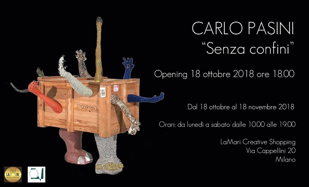 Il18 ottobre 2018, LaMari Creative Shopping, concept store nel cuore di Milano, inaugura la stagione autunnale con la mostra personale di Carlo Pasini “ Senza Confini”. In esposizione una selezione dei lavori più recenti dell’artista, dove puntine da disegno e spilli danno vita a quadri con icone della cultura pop e a sculture di animali dinamici e guizzanti, dai manti estremamente realistici e precisi, realizzati con l’aiuto di un esperto tassidermista..