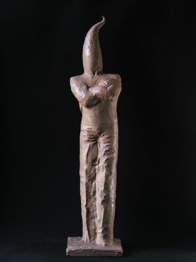 Si tratta di soggetti in cui si afferma la fertile capacità creativa dell’artista nel plasmare forme intrise di riferimenti antropologici in evoluzioni immaginifiche ma forse non troppo lontane dalla nostra prossima , a cui si affiancano riflessioni su un futuro del mondo che ci circonda in cui animali, elementi vegetali, semplici oggetti si confondono, si sovrappongono, si aggrovigliano nell’impianto scultoreo, che in questa raccolta si esplica soprattutto nella materia lignea. La mostra propone inoltre una sequenza di una decina di disegni, anche di grandi dimensioni (cm 150x260). I soggetti grafici sono simbioticamente collegati alla dialettica che si manifesta nei volumi scultorei. Questi non debbono essere certo visti come disegni preparatori ma come vero e proprio connubio espressivo della sua arte, in cui si esprime da parte dello scultore una disponibilità intrinseca nel partecipare con profonda sensibilità alle inquietudini del proprio tempo: si traduce così nella materia o sul foglio bianco una vertigine di profili di proiezioni visionarie”.