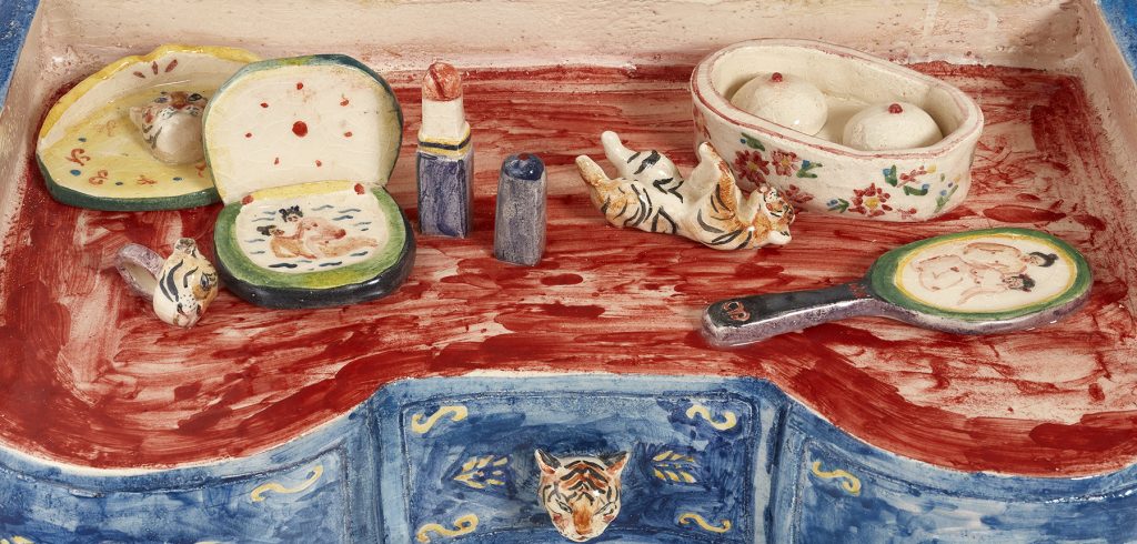 Il maiale, la tigre, il pesce - animali preferiti da Shafei e allegorie dei sentimenti umani - sebbene utilizzati già da tempo, mutano e seguono l’evoluzione dell’artista. Ne è prova la feroce tigre che nel tempo è stata addomesticata e ora diventa compagna fedele, divertita. Si rigira nell’atto di giocare e si aggira tra la galleria, spiandoci. “Negli anni ho trovato somiglianze tra gli animali e gli uomini, siamo tigri da conoscere, maiali incompresi, tartarughe che strisciano in giro” come ci racconta la stessa Shafei.