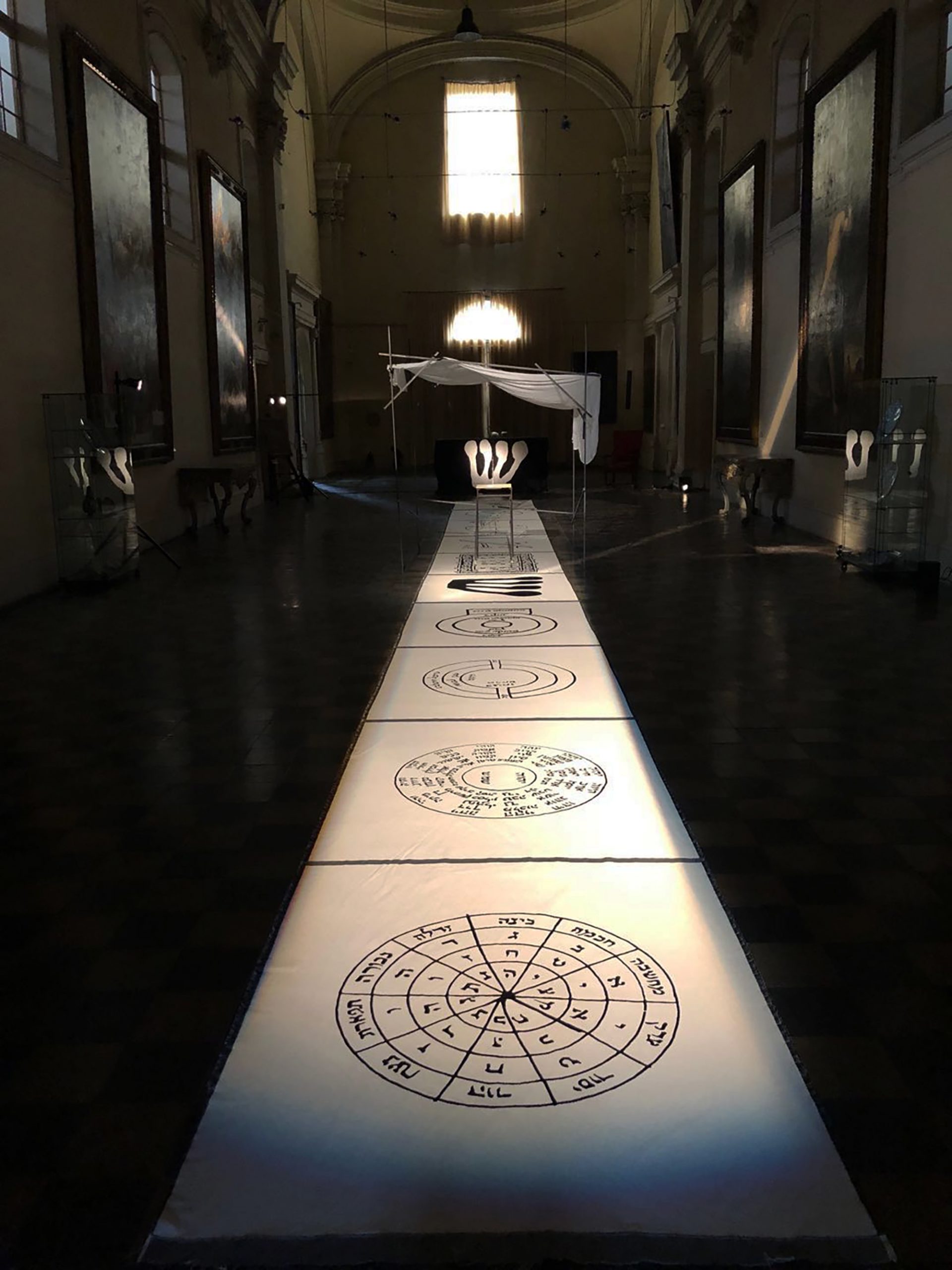 Shul in questa versione installativa traccia lo spazio con luce e suono, portando lo spettatore in un luogo ibrido dell'anima. Il luogo del raccolto e del racconto. Uno spazio sacralizzato questo, protetto e fragile di cui la storia ne ha appunto mostrato le complessità e contraddizioni, qui risolte in una voce sonora e in disegni cabbalistici che fanno della tradizione ebraica un punto di raccordo spirituale universale.