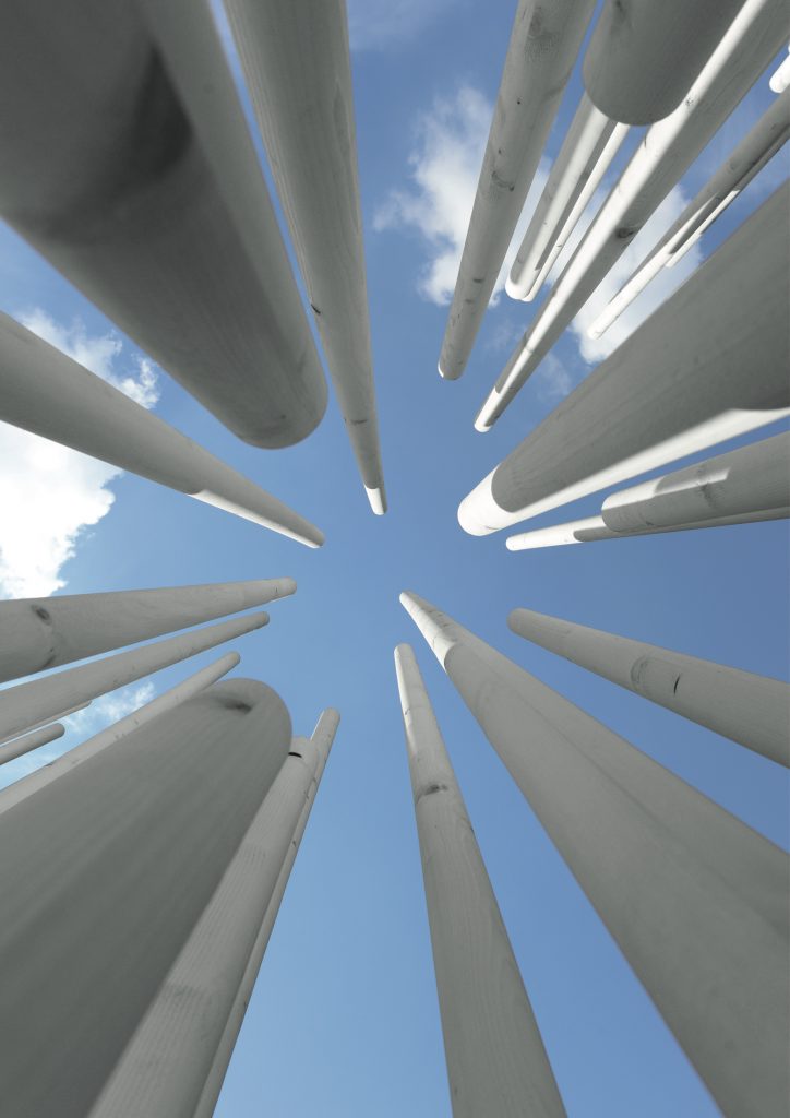 Oggi, a quello stesso invito risponde Boeri con un prototipo di spazio pubblico, Radura degli abbracci, declinazione del progetto Radura (2016), che qui si compone di novantacinque cilindri di legno d’abete di cinque metri di altezza e sei centimetri di diametro, che creano un luogo al contempo permeabile e intimo, in cui i visitatori possono accedere per vivere un’esperienza originale di contatto con la natura, accompagnati dalla suggestiva melodia del violoncello di Piero Salvatori con il brano “Visioni”.