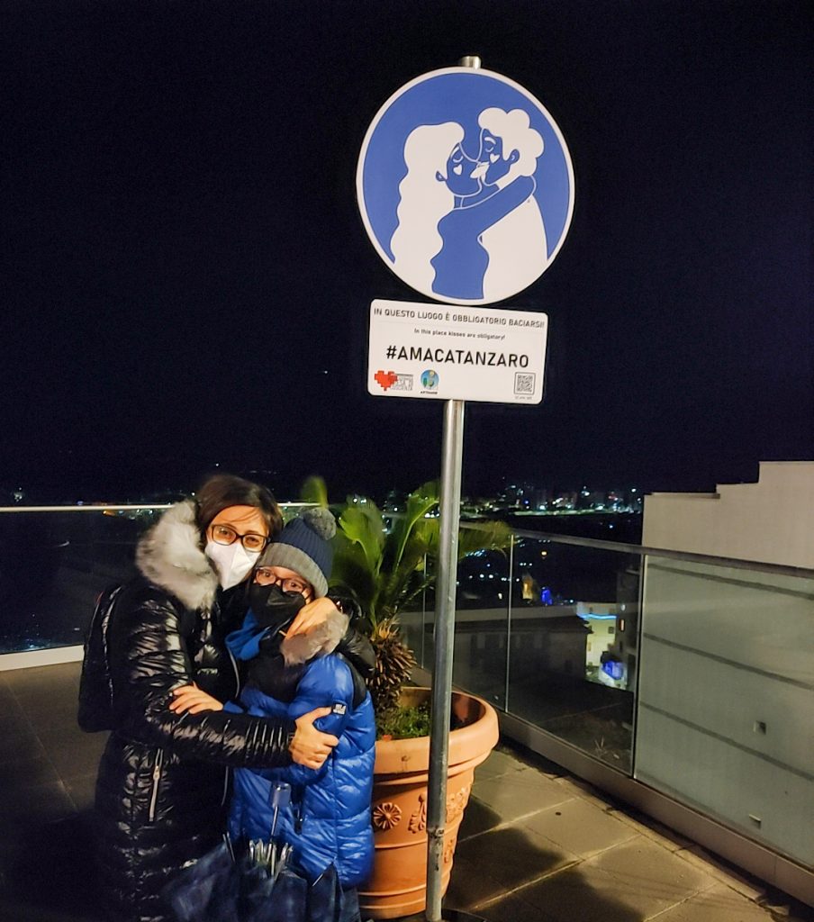 Per favore baciatevi, “Kiss Please”. É questo il primo cartello stradale realizzato da Artemide e posizionato momentaneamente per l’evento del 5 e 12 dicembre 2021 (Urban Trekking in Love) sulla balconata di Bellavista che “obbliga” cittadini e turisti a baciarsi sulle note della poesia di Elena Verzì.