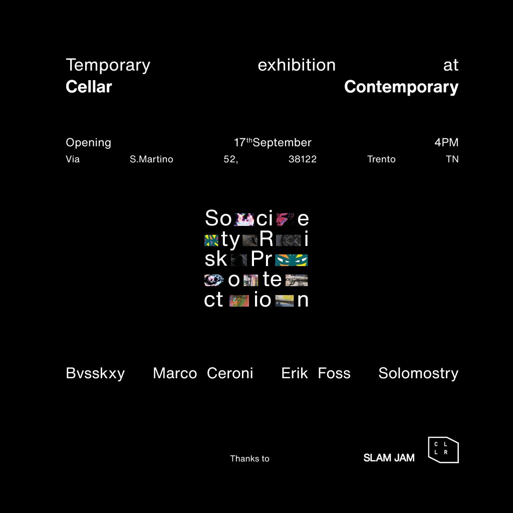 Society Risk Protection è un progetto transdisciplinare curato da Carlo Chiusi, un tentativo di mettere in luce le cripticità dei rischi sociali ma anche di rivelare i nascondigli che da tempo abbiamo creato per proteggerci. Raggruppando i lavori di visual artist, designer, pittori, e scultori si vuole sottolineare la capacità disvelatrice di opere che possono essere veicolo informativo oltre che di espressione estetica. I contributi si focalizzano sull’indagine di strutture sociali e stilemi che riguardano la privacy e la sorveglianza, cercandone i reagenti. Il fruitore è qui osservato costantemente, come fosse protagonista di un programma feticcio voyeurista. Spiati, osservati e osservabili.