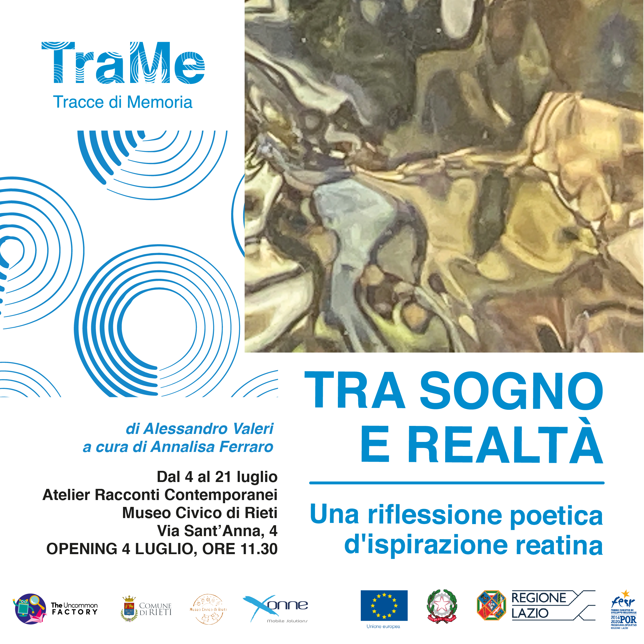 TraMe si prepara a inaugurare la mostra "Tra sogno e realtà. Una riflessione poetica d'ispirazione reatina" di Alessandro Valeri, il 4 luglio, alle ore 11.30, nell’Atelier Racconti Contemporanei del Museo Civico di Rieti, in Via Sant’Anna 4.
