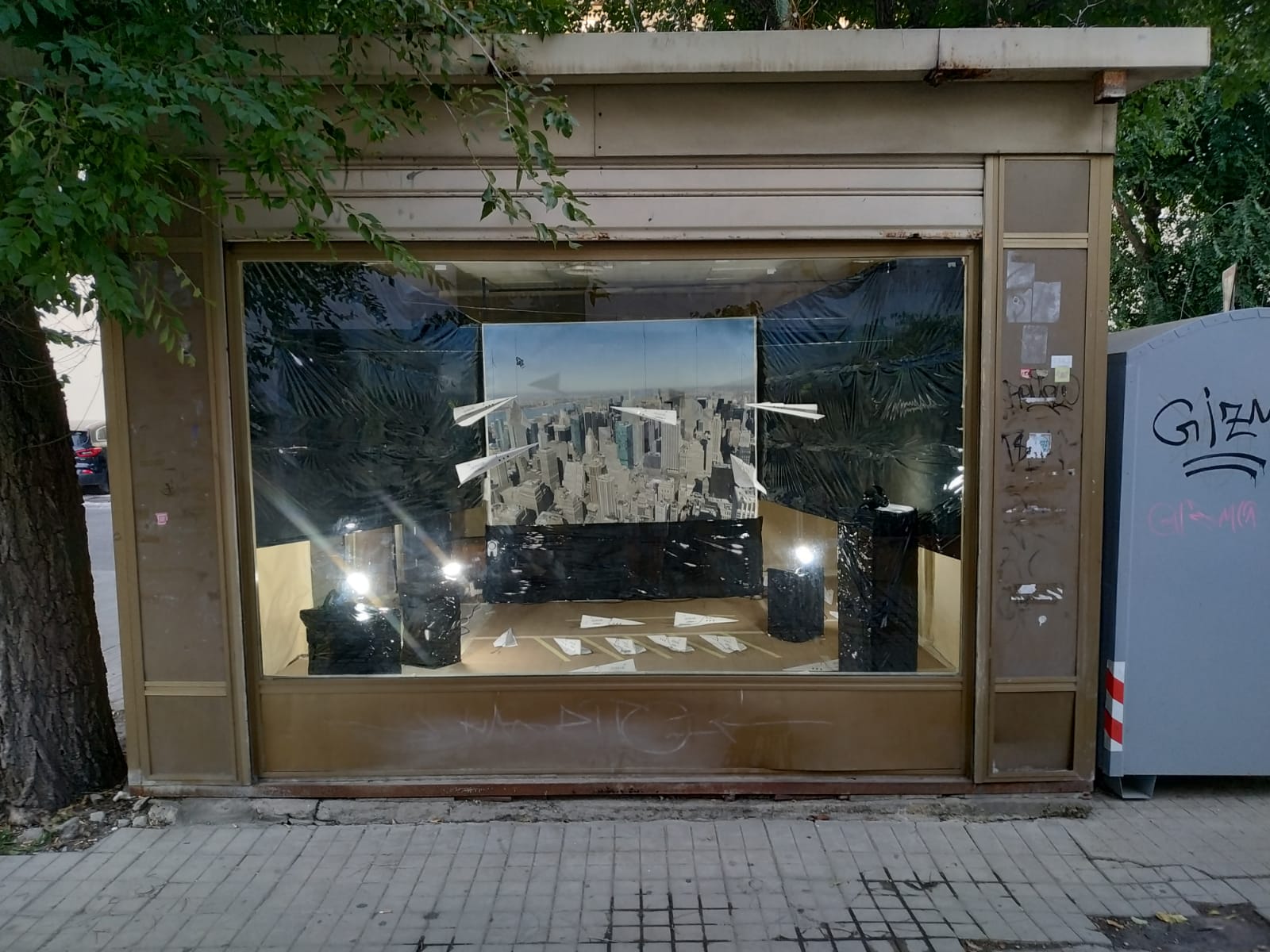 L’interno dell’ex Chiosco Mondadori è stato rivestito per l’occasione con carta d’imballaggio, al centro della vetrina New York, con degli aerei di carta che volteggiano su di lei, immagine evocativa, rimanda all’undici Settembre 2001 e al crollo delle twin tower’s, gli arei di carta vanno oltre il ludico gioco di un bambino e metaforicamente si accostano alla fragilità di vite sequestrate in volo, alcuni arei sono a terra, non sappiamo se pronti a spiccare il volo o fermi in stato d’allerta, in attesa del da farsi.
