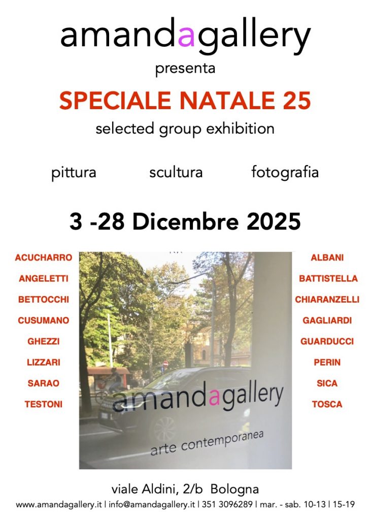 Gli artisti presenti in ordine alfabetico: Achucarro, Albani, Angeletti, Battistella, Bettocchi, Chiaranzelli, Cusumano, Gagliardi, Ghezzi, Guarducci, Lizzari, Perin, Sarao, Sica, Testoni, Toschi. La galleria sarà aperta anche l’8 dicembre, domenica 21, lunedì 22 e domenica 28 oltre al consueto orario mar-sab 10-13 | 15-19. I prezzi delle opere esposte sono compresi tra 1.100€ e 3.900€. Per Info: 3513096289 | info@amandagallery.it | www.amandagallery.it | @amandagallerybologna.
