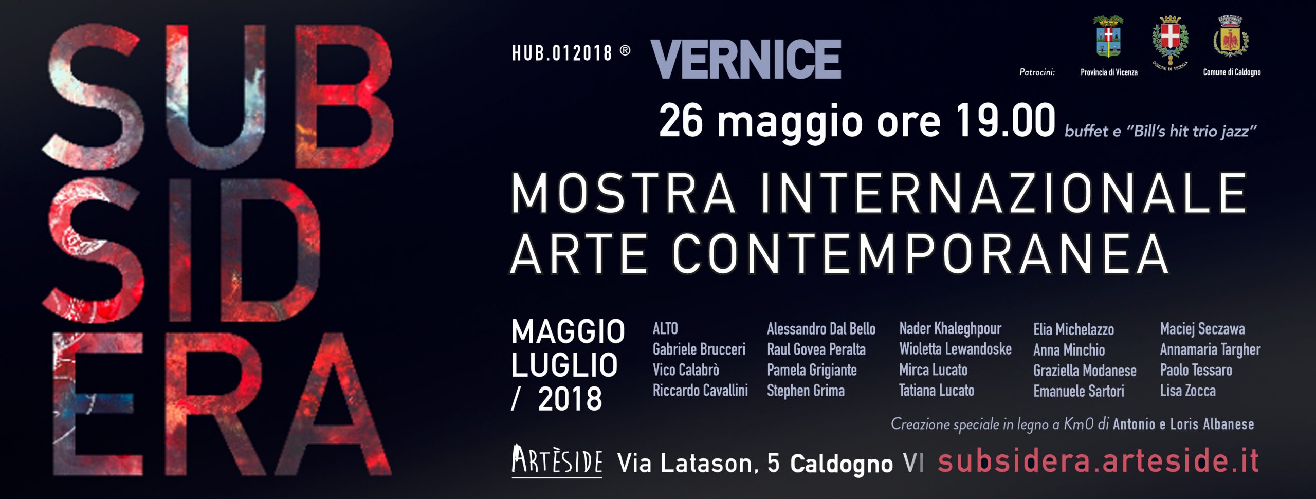 Inaugurerà il 26 maggio alle 19 a Caldogno presso lo spazio Artèside con una vernice che si annuncia pirotecnica la mostra collettiva Subsidera, che ospita venti artisti locali e internazionali. Padrone di casa e organizzatore è Alessandro Dal Bello, coadiuvato da Tatiana Lucato, artisti in mostra anche come ALTO, il nome che coniuga sul filo della doppia identità le loro espressioni diverse ma consonanti e complementari in opere di taglio più tradizionale e installazioni luminose (i Boxsidera). Curatrice è la storica dell’arte Mara Seveglievich.