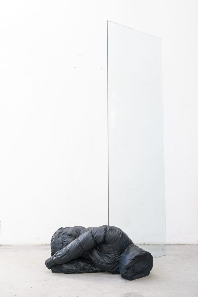 Dei piumini, solo all’apparenza leggeri, riescono a tenere in piedi, andando contro le leggi della fisica, delle pesanti lastre di vetro. Questi piumini racchiudono dei corpi invisibili di cui si possono riconoscere solamente delle masse inermi. Corpi come se ne vedono tanti buttati a terra nelle strade di tante, troppe, città del mondo. Gente abbandonata, specchio di una società alla deriva. Ma è questa visione sospesa, seppur all’interno di una condizione di grande crudezza, che li rende leggeri.