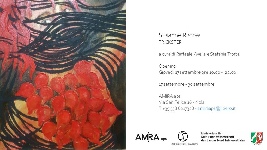 L'associazione Amira aps in collaborazione con Il Laboratorio/Le edizioni di Nola è lieta di presentare TRICKSTER, la personale di Susanne Ristow a cura di Raffaele Avella e Stefania Trotta.