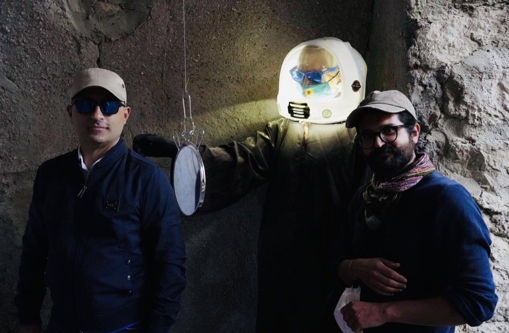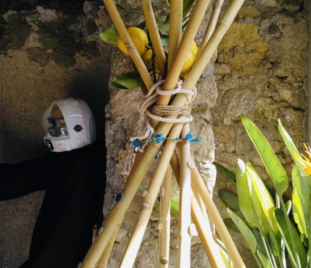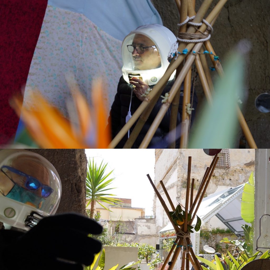 Tre sono gli elementi principali: un monaco (1) con un casco spaziale alla Star Wars (utilizzato da Beppe Grillo prima della pandemia) intento a comunicare con un patchwork (2) salvifico ricavato dal suo insediamento, su cui appare una effige di Pazuzu, re degli spiriti malvagi dell'aria, posto dirimpetto la rappresentazione pittorica di un polmone, il tutto illuminato da una pioggia stellata di riflessi (3) emanati da alcuni specchi adornati da agrumi. Sottile è la comicità con cui la tenda, la skené, si trasforma in "scena" verticale da osservare. Comico, sì, ma anche doloroso.