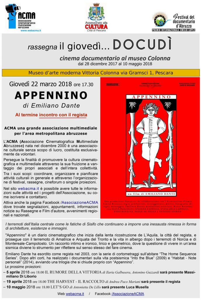 L’Assessorato alla Cultura del comune di Pescara e l’associazione A.C.M.A. (Associazione Cinematografica Multimediale Abruzzese), vi invitano giovedì 22 marzo al settimo appuntamento della rassegna “il giovedì… DOCUDÌ cinema documentario al museo Colonna” alle ore 17.30 presso il Museo d’arte moderna Vittoria Colonna in via Gramsci 1 a Pescara, alla proiezione di ”Appennino” di Emiliano Dante. Al termine della proiezione, incontro con il regista