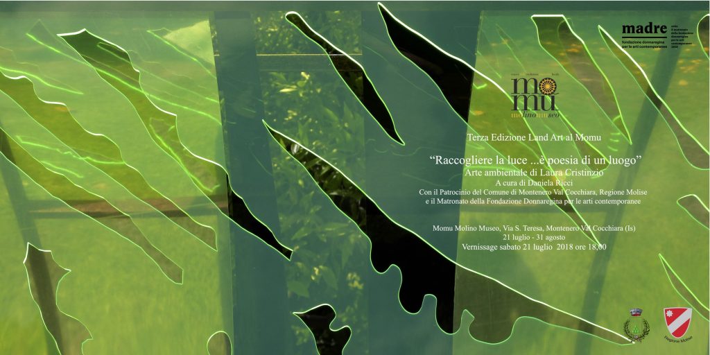 In un’epoca di grandi cambiamenti climatici, geofisici e sociali, di risorse condivise e frammentate tra nuovi paesi emergenti, la Land Art, corrente dell'arte concettuale, nata negli Stati Uniti negli anni ’70, è sempre più spesso caratterizzata dall'attenzione per la natura e dall'interesse per l'ecologia, che contraddistinguono la ricerca artistica nella sua relazione con il paesaggio. Tra le principali caratteristiche della Land Art c'è quella di essere effimera e provvisoria. Una sorta di rituale mistico che sprigiona energia fisica e mentale e va ad impattare con la natura come in una danza simbiotica di fusione totale. A Laura Cristinzio è dedicata la terza rassegna con le sue opere pensate e realizzate site-specific, invadendo i giardini del Momu Molino Museo a Montenero Val Cocchiara in Molise, un antico mulino restaurato e funzionante.