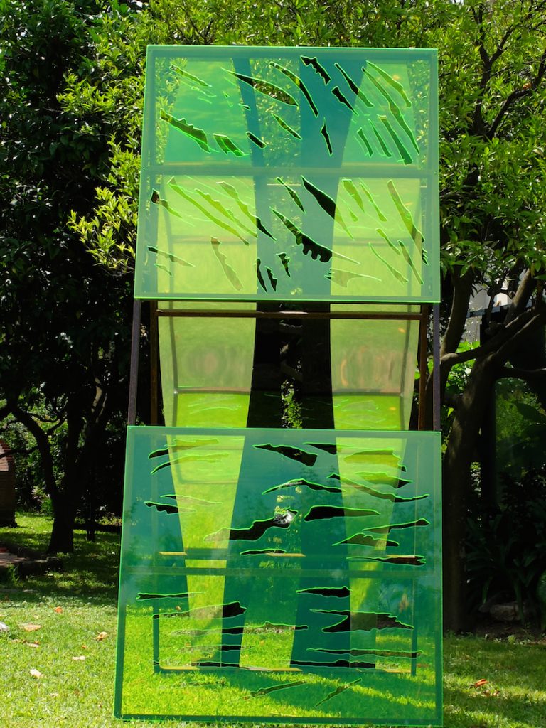 Nell'area circostante del Momu saranno collocate le strati-grafie: formate da telai in acciaio che costituiscono un'ossatura su cui sono alloggiate le lastre di metacrilato verde fluo, nero e specchianti, che raccolgono e si lasciano attraversare dai tempi della luce catturandone tutte le variazioni possibili; ad ogni sguardo la vegetazione circostante, la natura di questo particolare luogo vi si rispecchia.