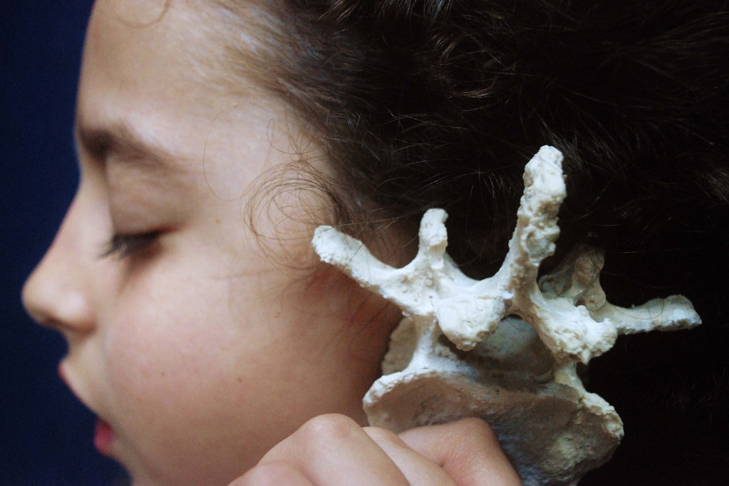 Le prime sono il frutto di una residenza in Bretagna, nella quale ha scelto il Mar d’Iroise come fonte di ispirazione per un ciclo di perfomance sonore e atelier con gli abitanti del luogo: attraverso i loro racconti di sparizioni e misteri legati a quel tratto di oceano, Angioletti ha dato voce a storie antiche e segrete, popolate di figure fantastiche e mitologiche costruendo una narrazione corale, fatta per lo più di vibrazioni sonore. Insieme ad essa e come sua conseguenza ha prodotto piccole sculture, alcune delle quali esposte nell’installazione, che riproducono a grandezza naturale alcune ossa del corpo umano - clavicola, scapola, denti, vertebre, osso sacro – scelte tra quelle che contribuiscono, attraverso la loro vibrazione, a produrre la voce. Queste sculture ad ascolto tattile sono la cassa di risonanza di un racconto misterioso che viene dal mare.