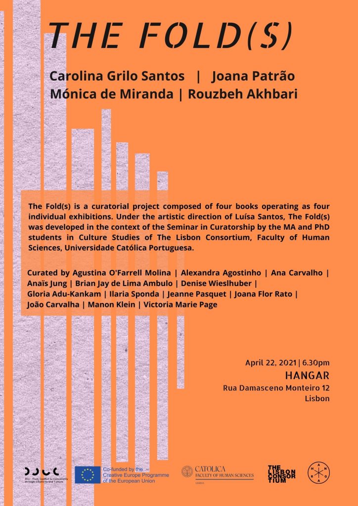 Adopting the Deleuzian idea of the fold as a desire of change (1993), The Fold(s) is a curatorial project composed of four books operating as four individual exhibitions by Carolina Grilo Santos, Joana Patrão, Mónica de Miranda, and Rouzbeh Akhbari. Under the artistic direction of Luísa Santos, The Fold(s) was developed in the context of the Seminar in Curatorship by the MA and PhD students in Culture Studies of The Lisbon Consortium, Faculty of Human Sciences, Universidade Católica Portuguesa.