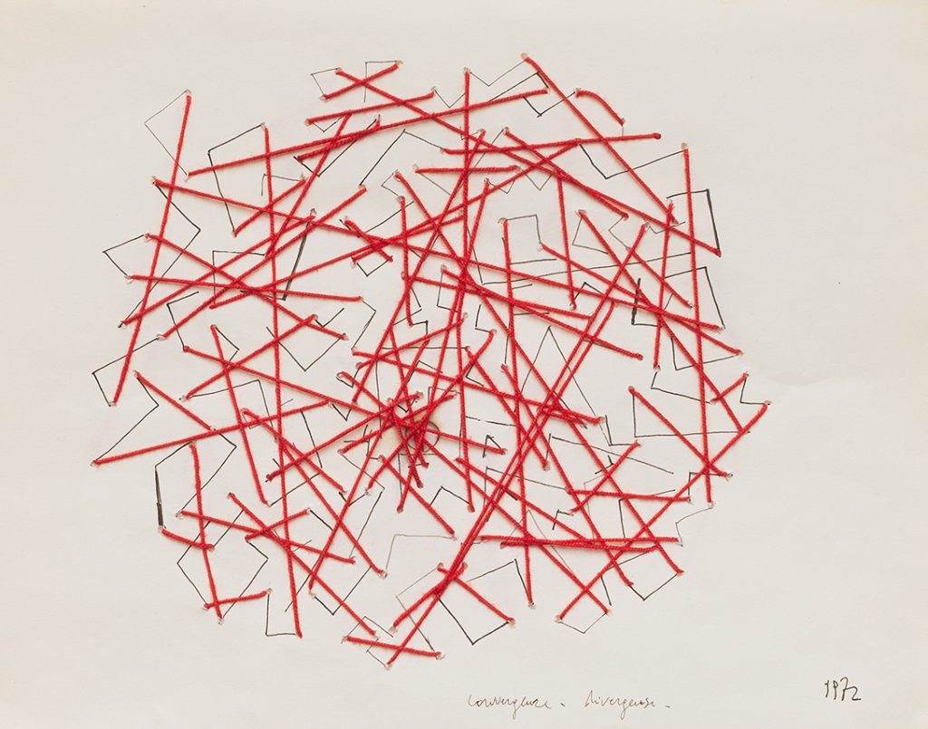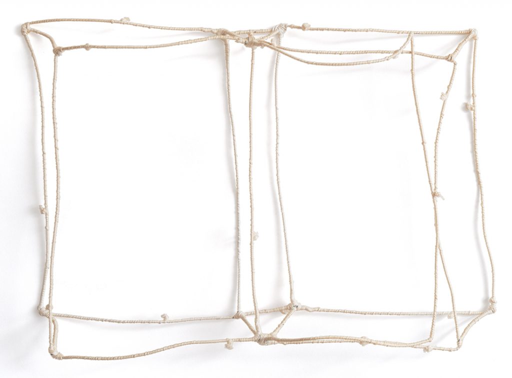 esempio “Convergenze divergenze”), con gli angoli raramente retti, spesso ottusi per indicare apertura, sfidano le tranquillanti certezze euclidee. Ne vengono scanditi spazi multipli che sconfinano nel metafisico. Per Elisabetta Gut il filo può essere vegetale.
